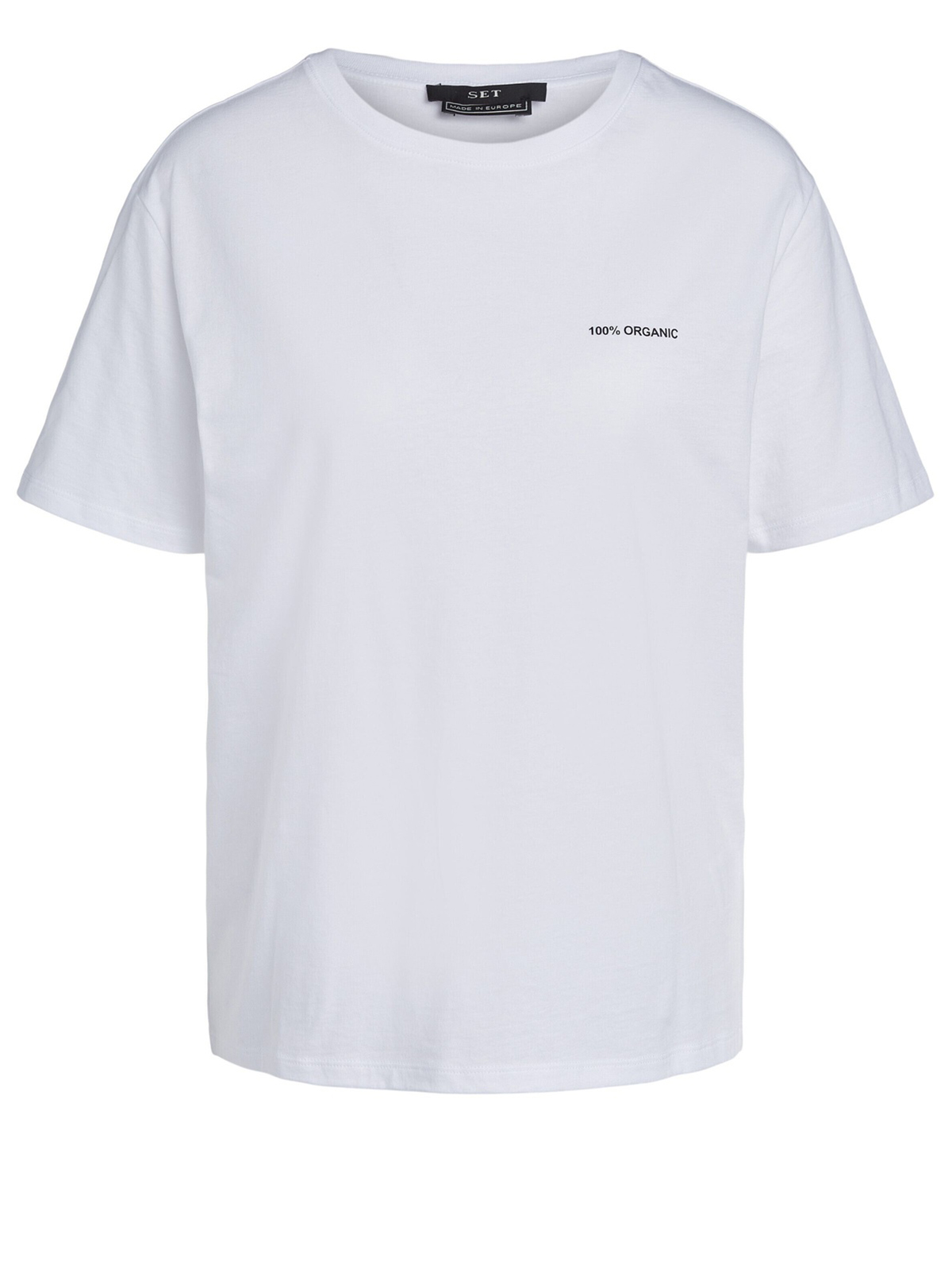Белая хлопковая футболка с оригинальным графическим принтом на спине. Прямой силуэт. Короткий втачной рукав, круглый вырез горловины.