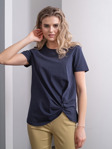 Ткань из натуральных материалов обеспечит комфорт и прохладу жарким летом. Круглый вырез горловины, декоративный элемент в виде фигурного узла и закругленный низ футболки создадут женственный образ. Данная модель будет хорошо сочетаться с брюками и с юбкой-карандашом.