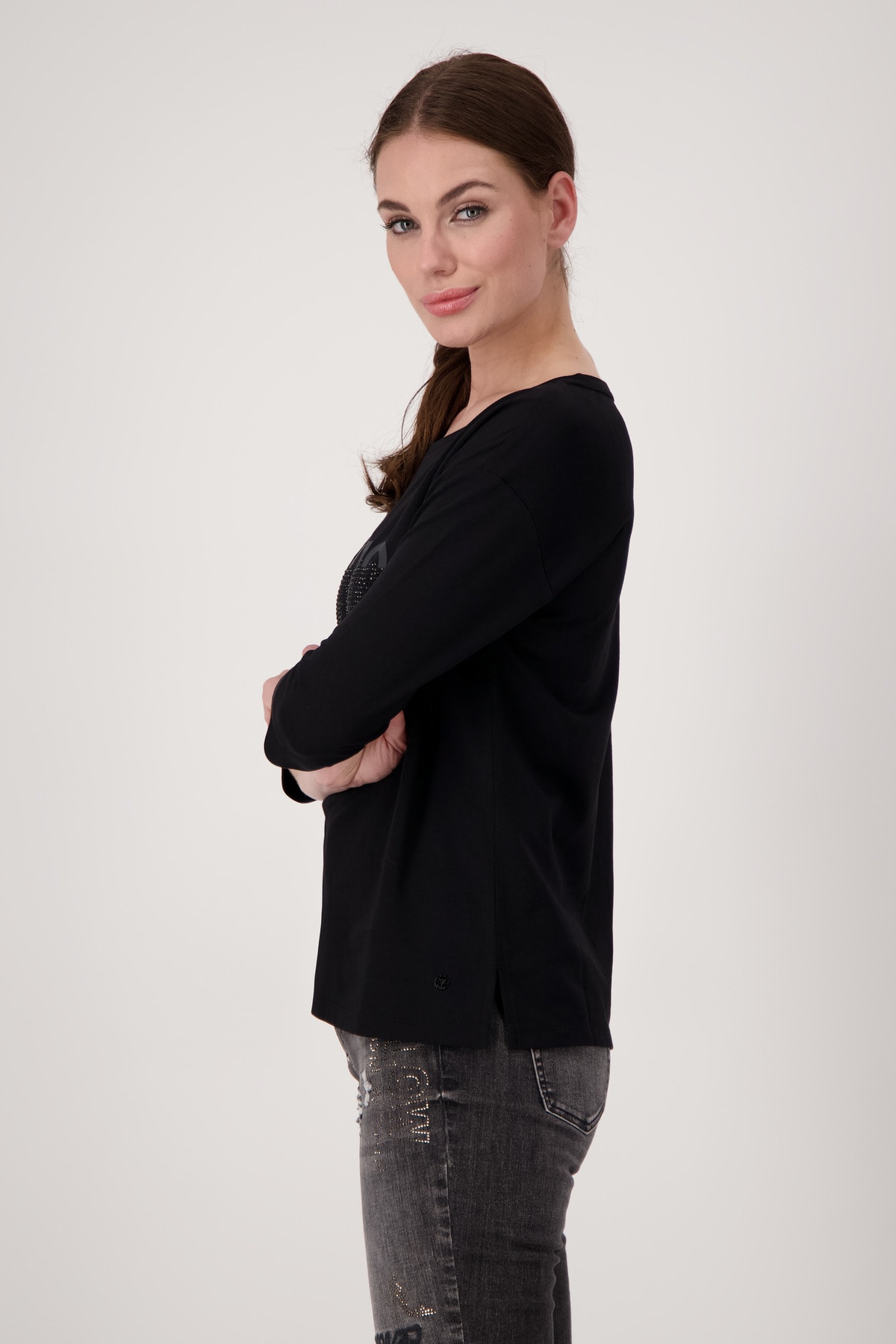На сайте указаны российские размеры. Футболка из джерси с рукавами 3/4 и стразами. Форма: прямой крой с манжетами на концах рукавов и вставкой на круглом вырезе горловины. Высококачественная смесь хлопка и модала обеспечит комфорт в течение всего дня. Вы не должны обходиться без этого. Модель ростом 179 см.