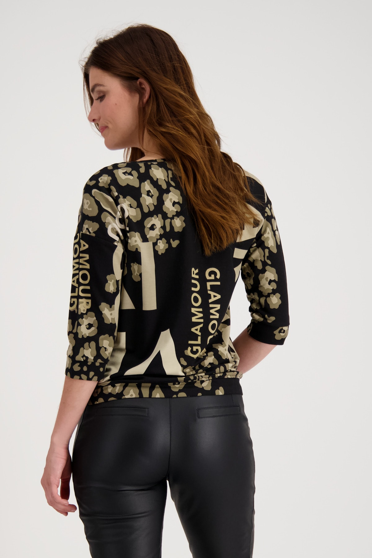 На сайте указаны российские размеры. Круглый вырез горловины со вставками, оверлочный шов с люрексом и необработанный край Рукава прямого кроя ¾ Обрезанные плечи с необработанным краем Надписи из пайеток и блестящий леопард спереди Сплошной принт с надписями Модель из струящейся смеси вискозы и модала с эластичной резинкой. Модель ростом 179 см. Длина спины 44 размера составляет 62 см.