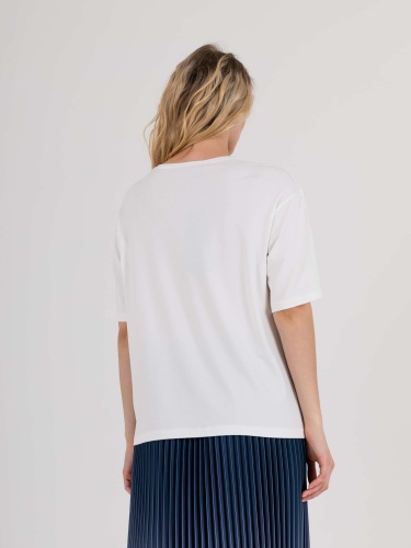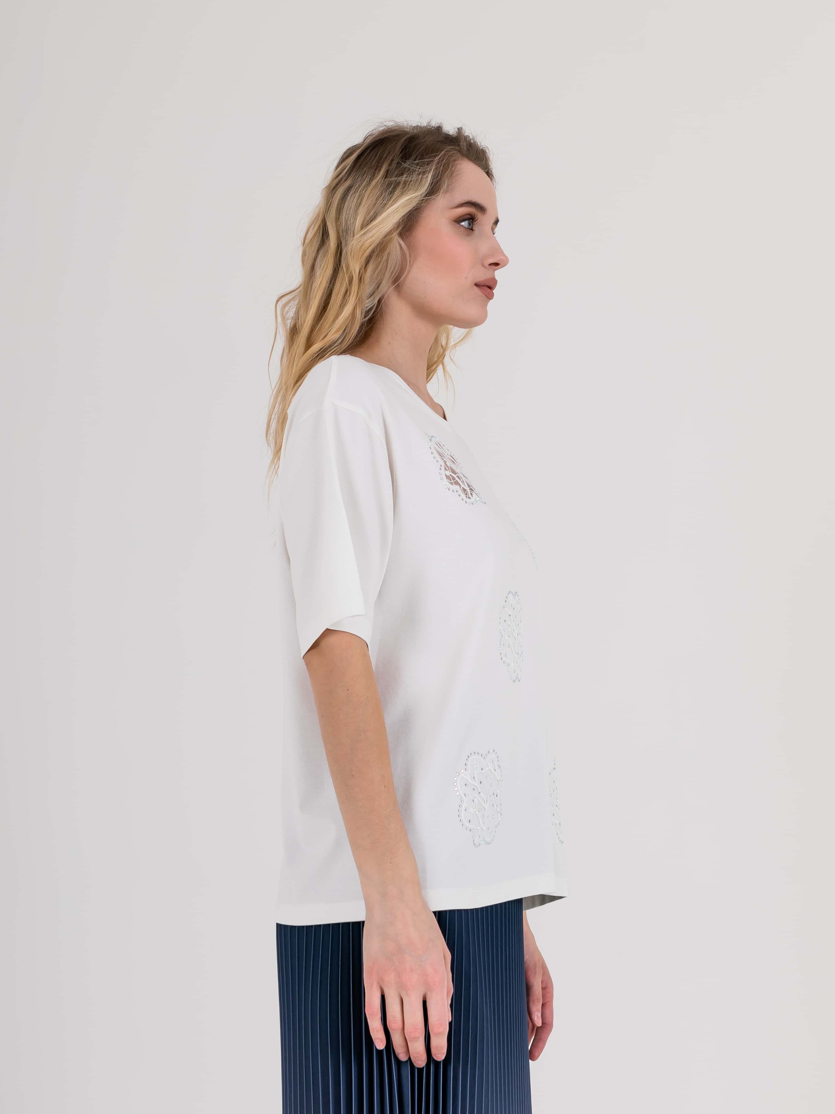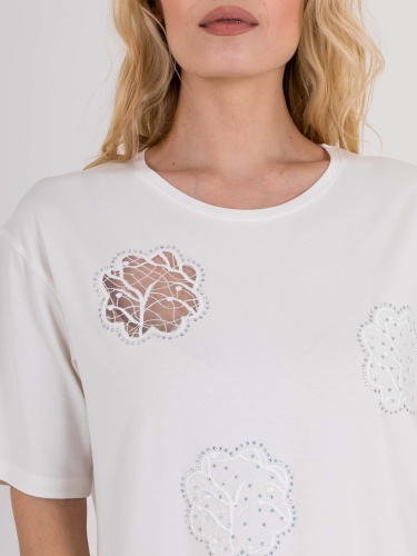 Длинная оверсайз футболка прямого силуэта из легкой, мягкой вискозы с добавлением эластана. По переду выполнена нежная вышивка на сетке, украшенная стразами. Укороченные втачные рукава со спущенной линией плеча. Круглый вырез горловины.