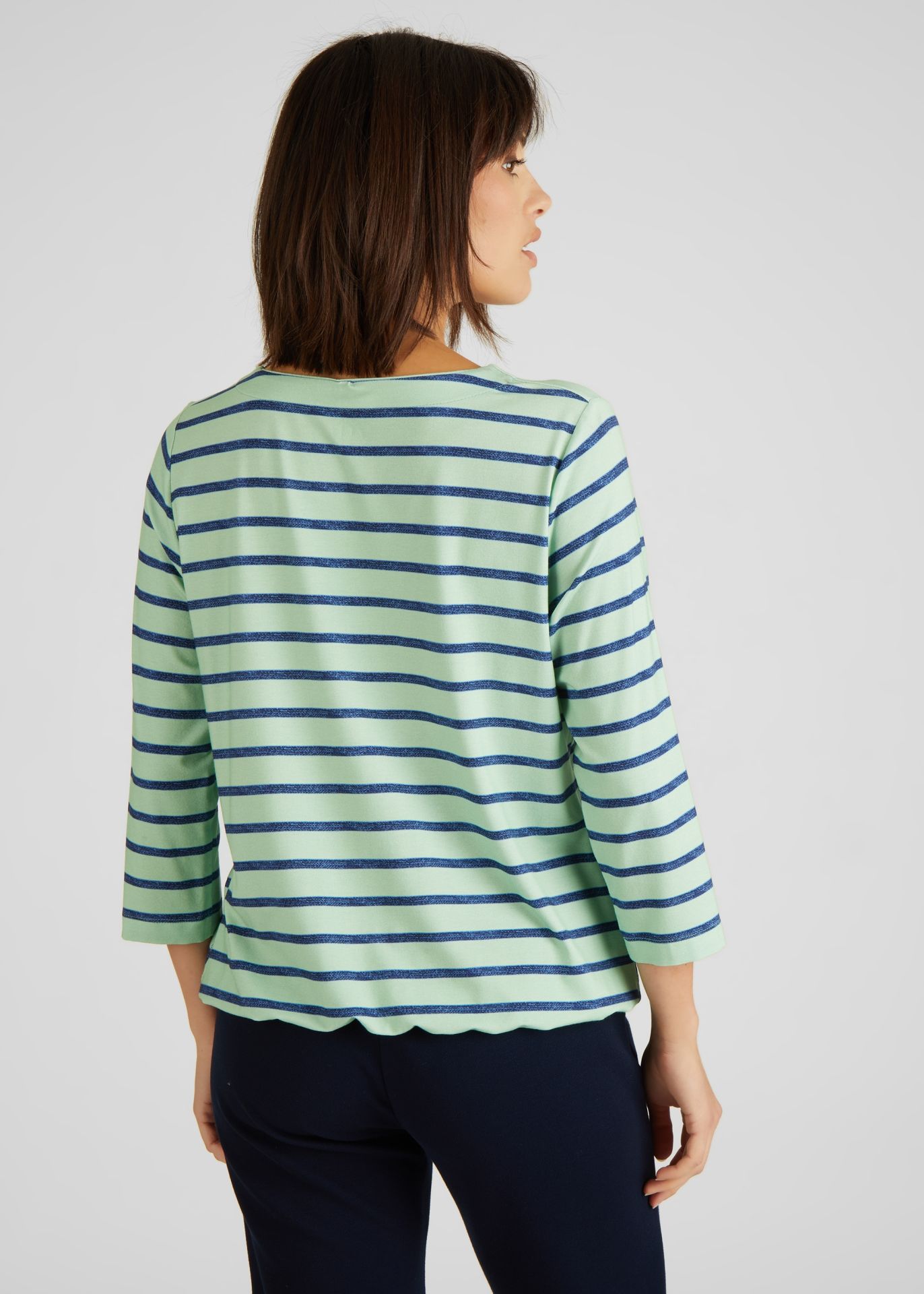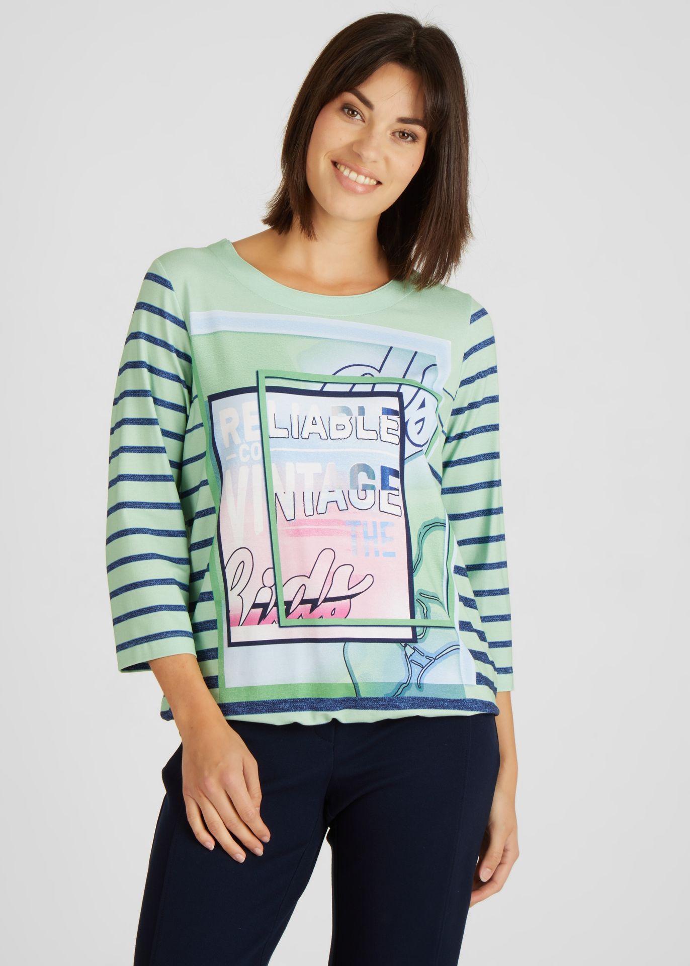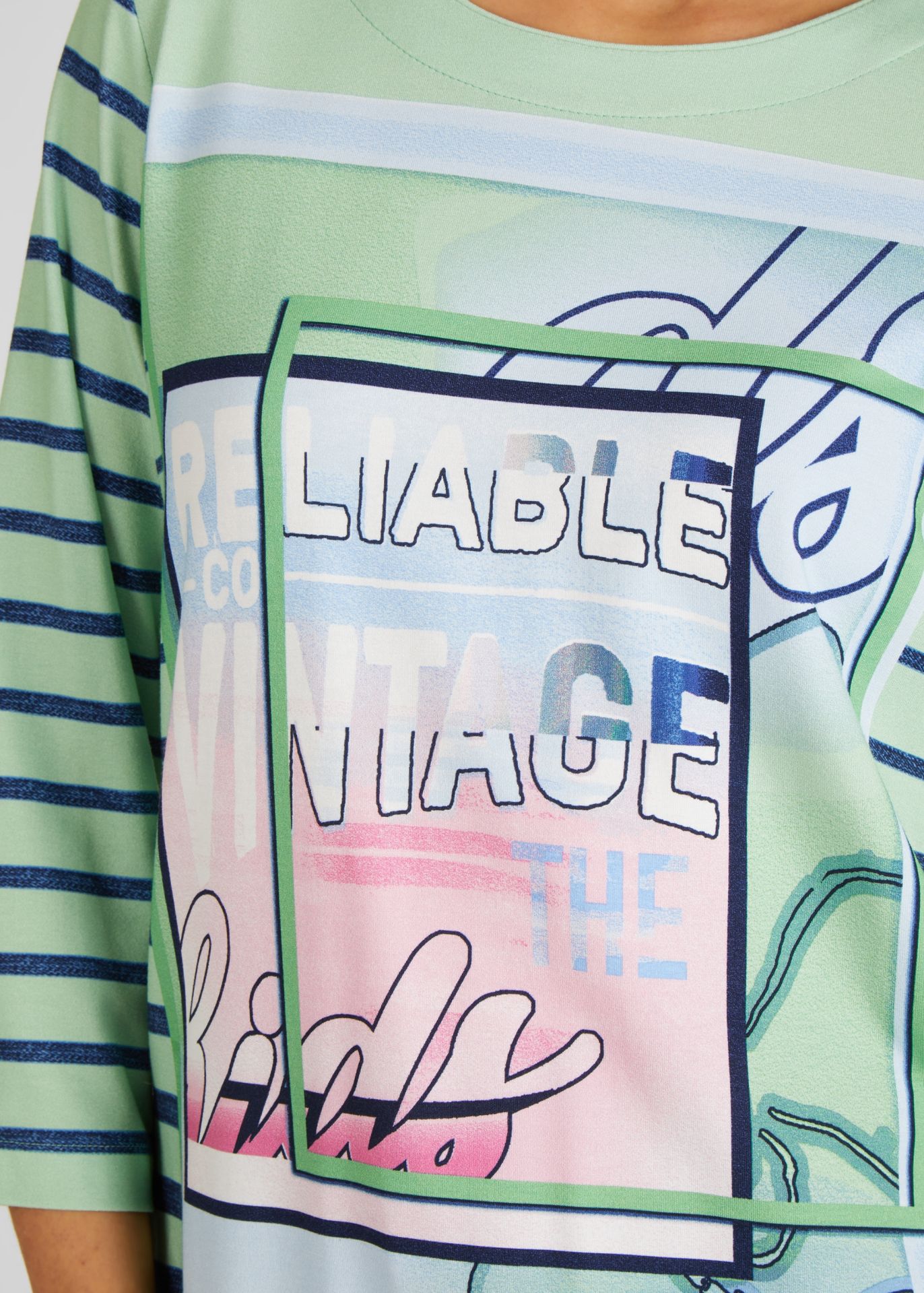 На сайте указаны российские размеры. Футболка с рукавом 3/4 выделяется экстравагантным принтом спереди. Полосатая рубашка прямого фасона с круглым вырезом имеет резинку по низу. Передний принт представляет собой образец интересно поставленной формулировки. Носите рубашку с джинсами или стильно с спортивными брюками. Длина по спинке от плеча для размера 46: 64 см. Рост модели 176 см.