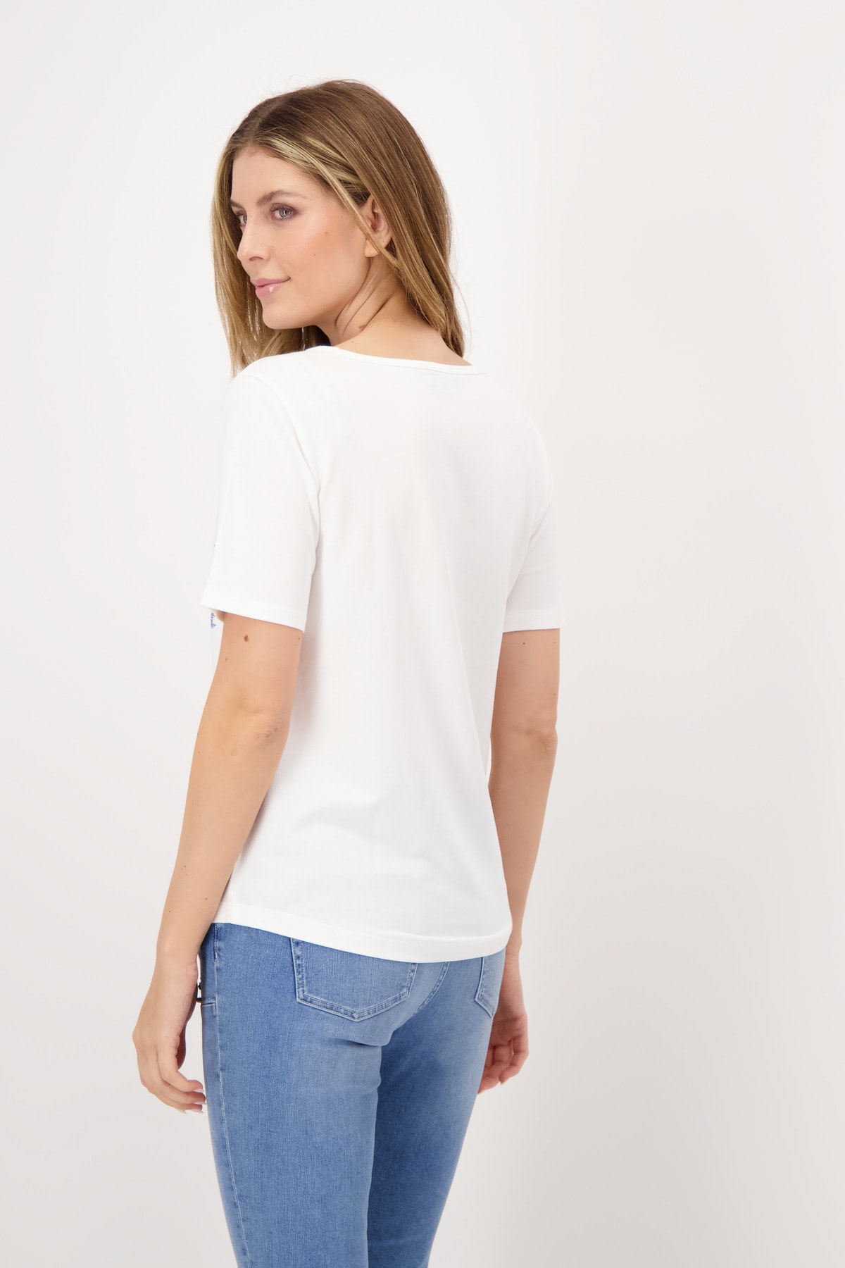 На сайте указаны российские размеры. Футболка с коротким рукавом с фотопринтом и стразами. Модель слегка приталена, имеет половинчатый рукав и круглый вырез горловины. В то время как фотопечать женщины украшена сверкающими стразами, надпись со сверкающими стразами придает женственной рубашке безошибочную изюминку. Смесь хлопка и модала гарантирует, что вы будете чувствовать себя абсолютно комфортно в этой белой рубашке с принтом. Чтобы сделать образ модным, советуем сочетать его со стильными джинсами облегающего кроя и украшениями. Длина по спинке 44 размера составляет 64 см. Модель ростом 178 см
