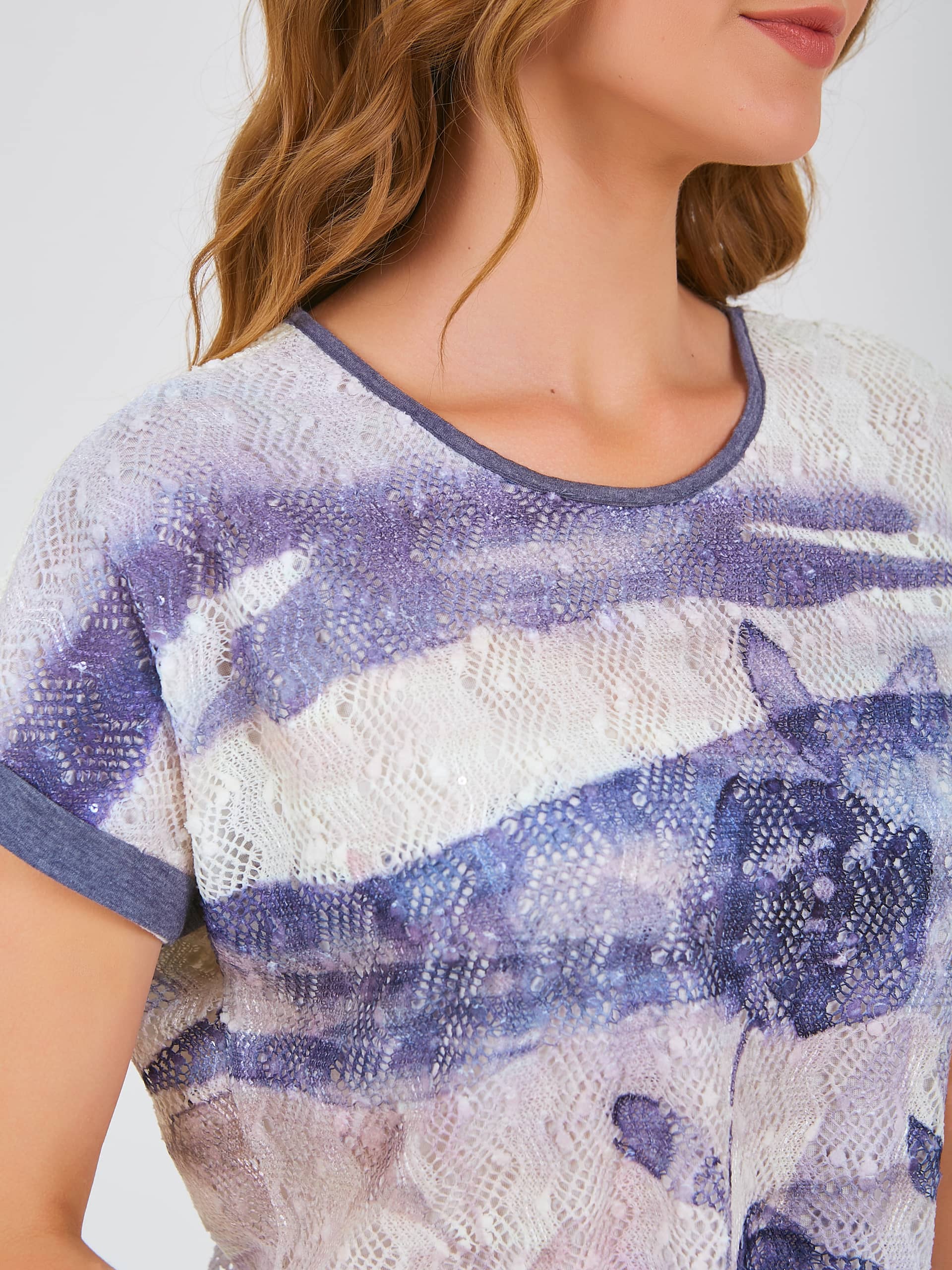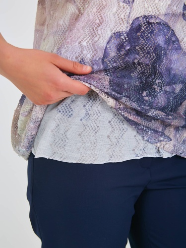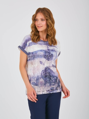 Двухслойная футболка средней длины прямого силуэта из полиэстера с добавлением мягкой вискозы, дизайнерская особенность модели – растительный принт и ажурный трикотаж. Короткие цельнокроеные рукава с манжетами. Круглый вырез горловины.