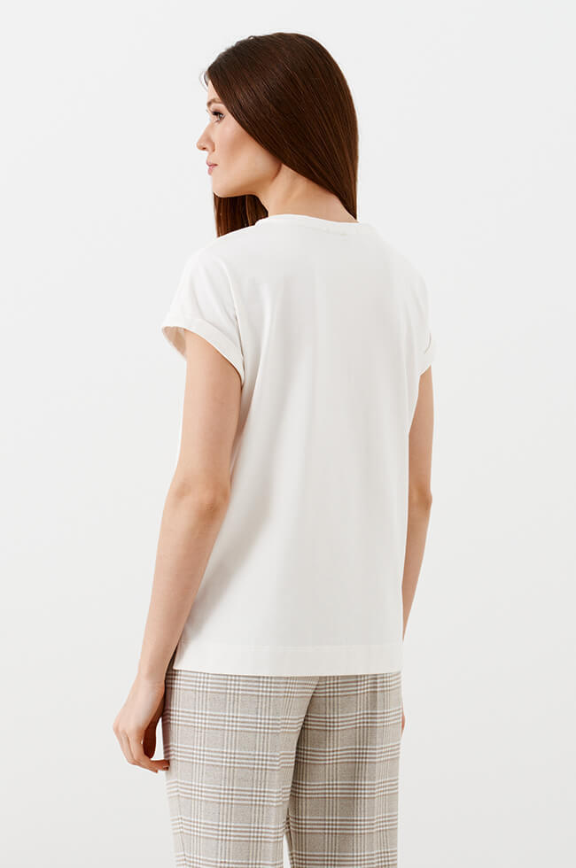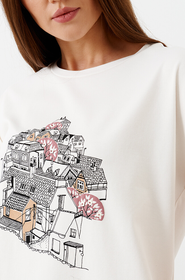 Футболка прямого силуэта, выполнена из трикотажного полотна. Овальный вырез горловины. Слегка спущенная линия плеча с небольшими цельнокроеными рукавами. Удлиненная спинка, боковые швы заканчиваются разрезами. Спереди выполнен дизайнерский принт «Городские мотивы», декорированный пайетками и стразами.