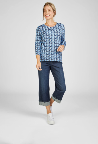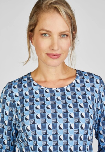 Футболка с рукавами 3/4 впечатляет стильным узором в клетку различных оттенков синего, подчеркнутым белыми бликами. Длина спинки от плеча для 44 размера: 62 см.