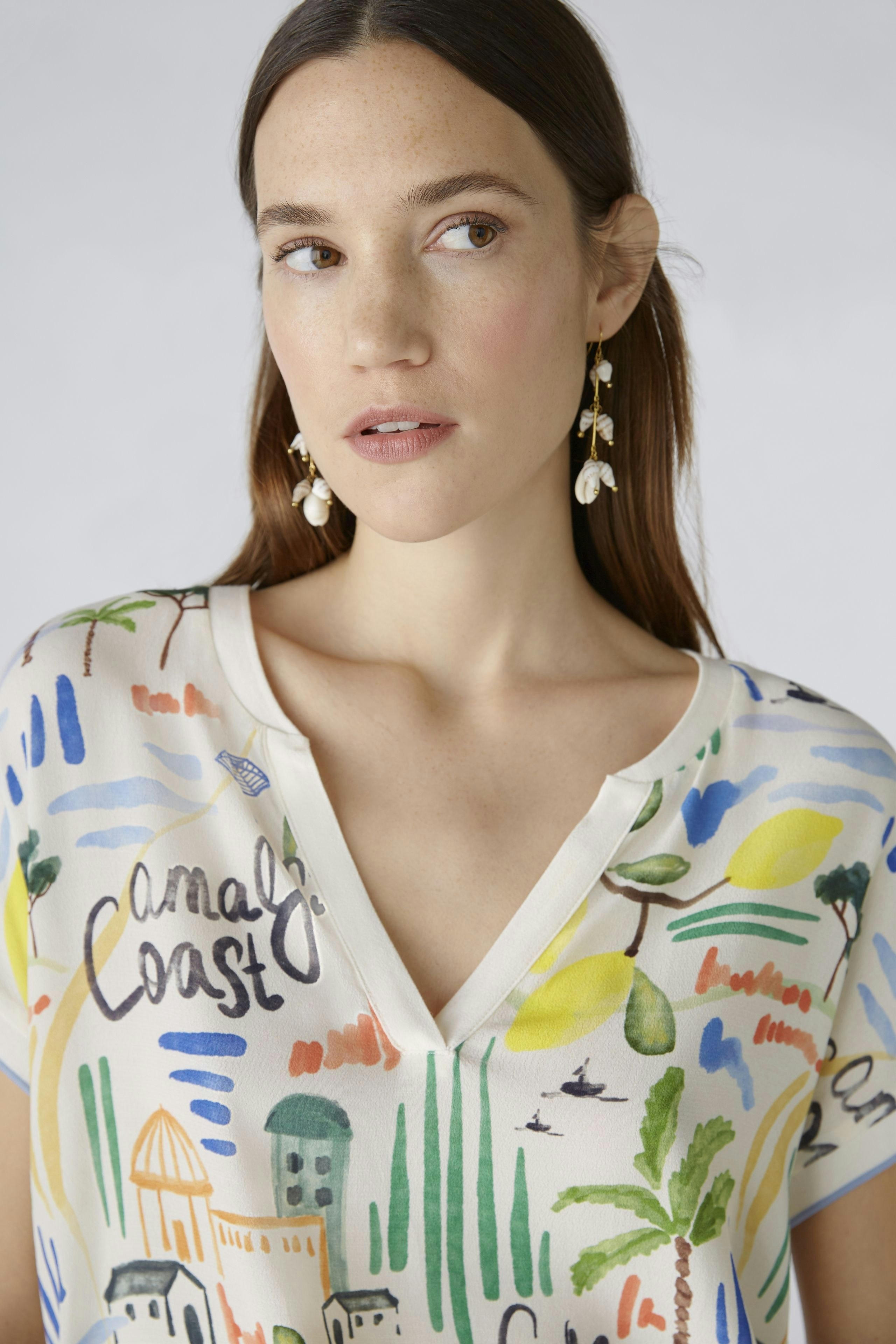 Блузка-рубашка - тканая блузка спереди с принтом oui exclusive, вдохновленным типичным ощущением отпуска на ривьере - удобная вставка из джерси с полосками сзади. Тканый вискозный креп спереди, трикотажная вставка сзади из эластичной смеси вискозы и хлопка. Повседневный крой, стандартная длина. Туника с вырезом. Ребристые манжеты на шее и рукавах. Закругленный низ, расширенный сзади. Каждая часть уникальна. Длина для размера 42: 64 см.