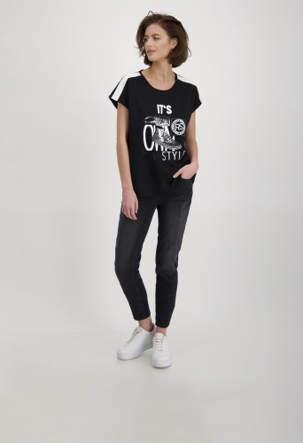 На сайте указаны российские размеры. Футболка из джерси с круглым вырезом, короткими рукавами и принтом. Модель прямого кроя с круглым вырезом горловины дополнена короткими рукавами большого размера и широким поясом по низу. Он становится изюминкой благодаря кокетке на плече с контрастной тесьмой, нашивке с блестками и эмблемой с объемными буквами, а также принту обуви с контрастной объемной надписью и сверкающими стразами. Сочетание хлопка и модала также обещает комфорт высокого качества. Носите его со стильными джинсами со стразами в тон, и образ будет более чем модным. Рост модели: 179 см. Длина по спине: 64 см.