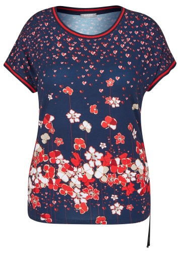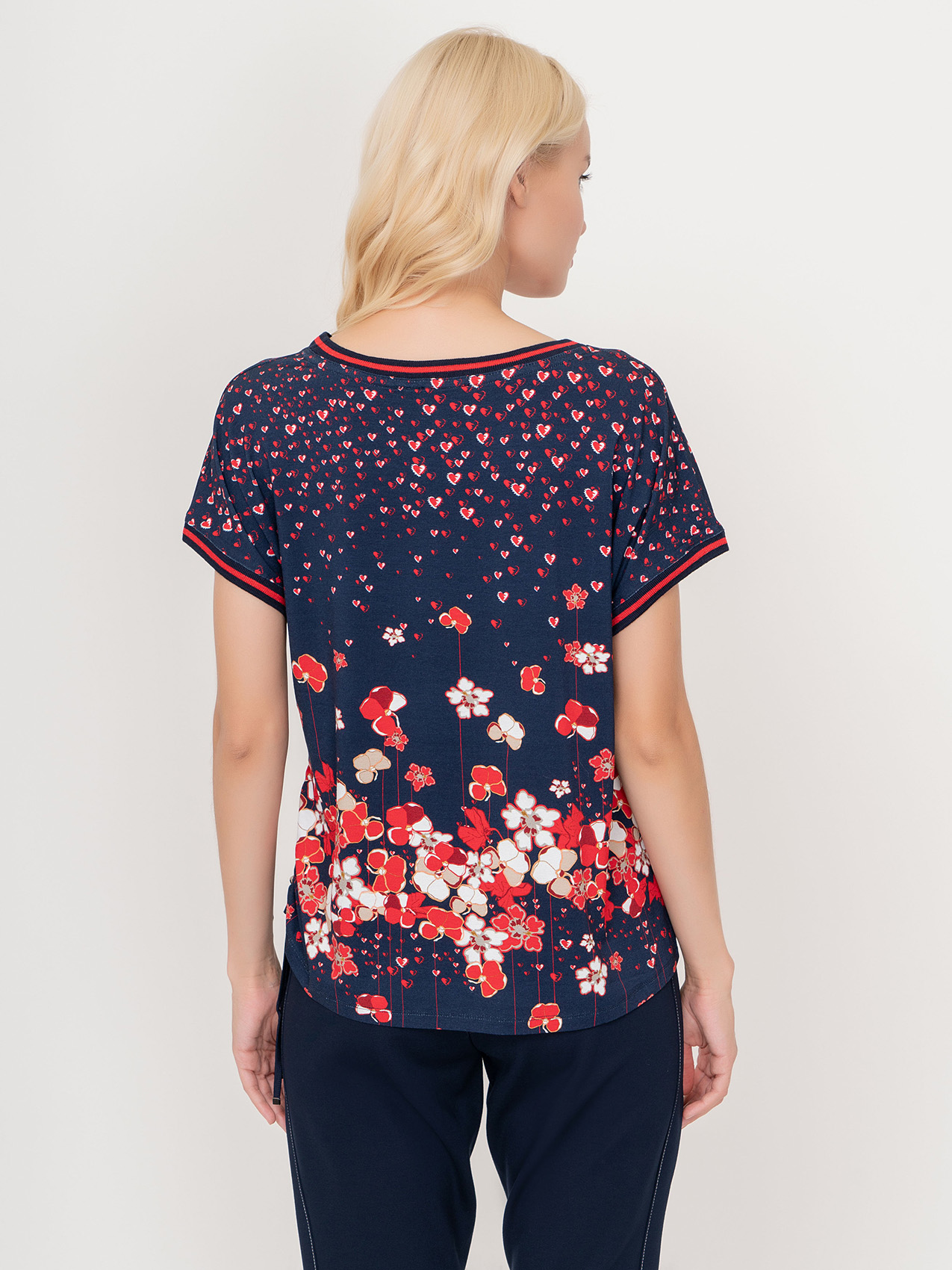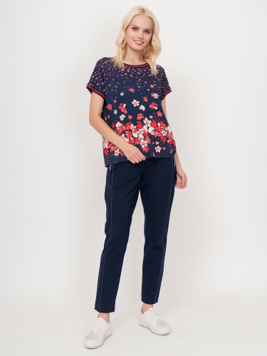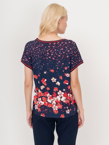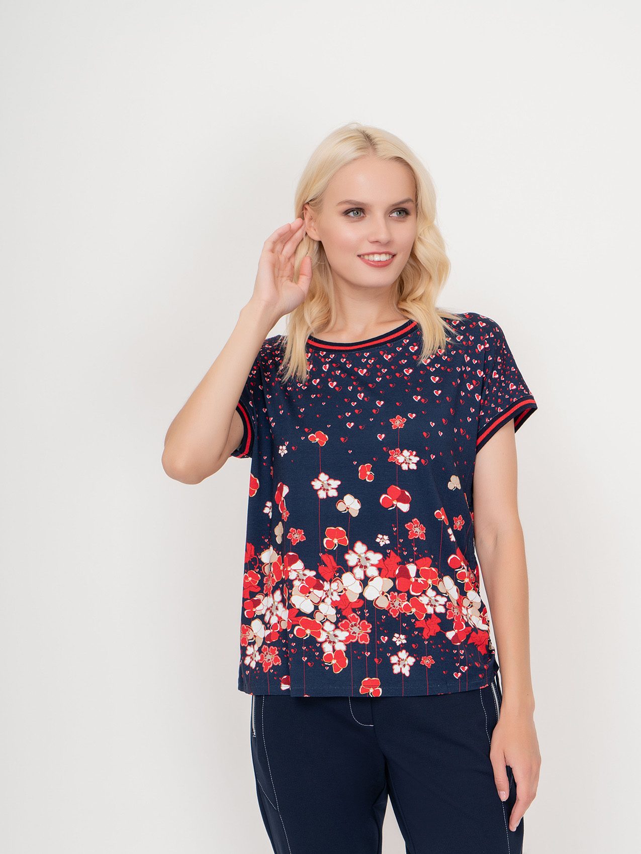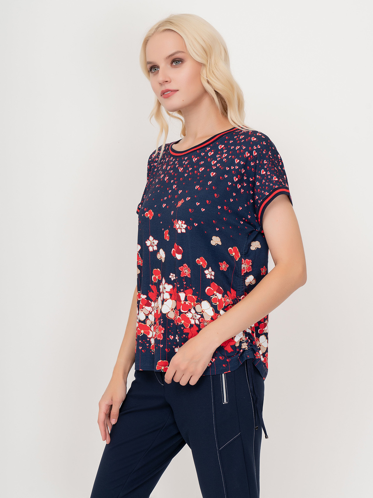 Эта футболка привлекает внимание контрастным принтом. Полуприлегающий силуэт. Круглый вырез горловины и короткие цельнокроеные рукава обработаны контрастной обтачкой в полоску. Еще одна особенность дизайна - кулиска в левом боковом шве, что позволяет регулировать длину и создать красивые драпировки. Приятный к телу материал из вискозной смеси обеспечивает комфорт в ношении.