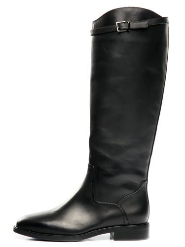 Женские кожаные сапоги жокейского стиля на подкладке из байки. Декорированы кожаным ремешком с пряжкой. Молния 3/4 с внутренней стороны.