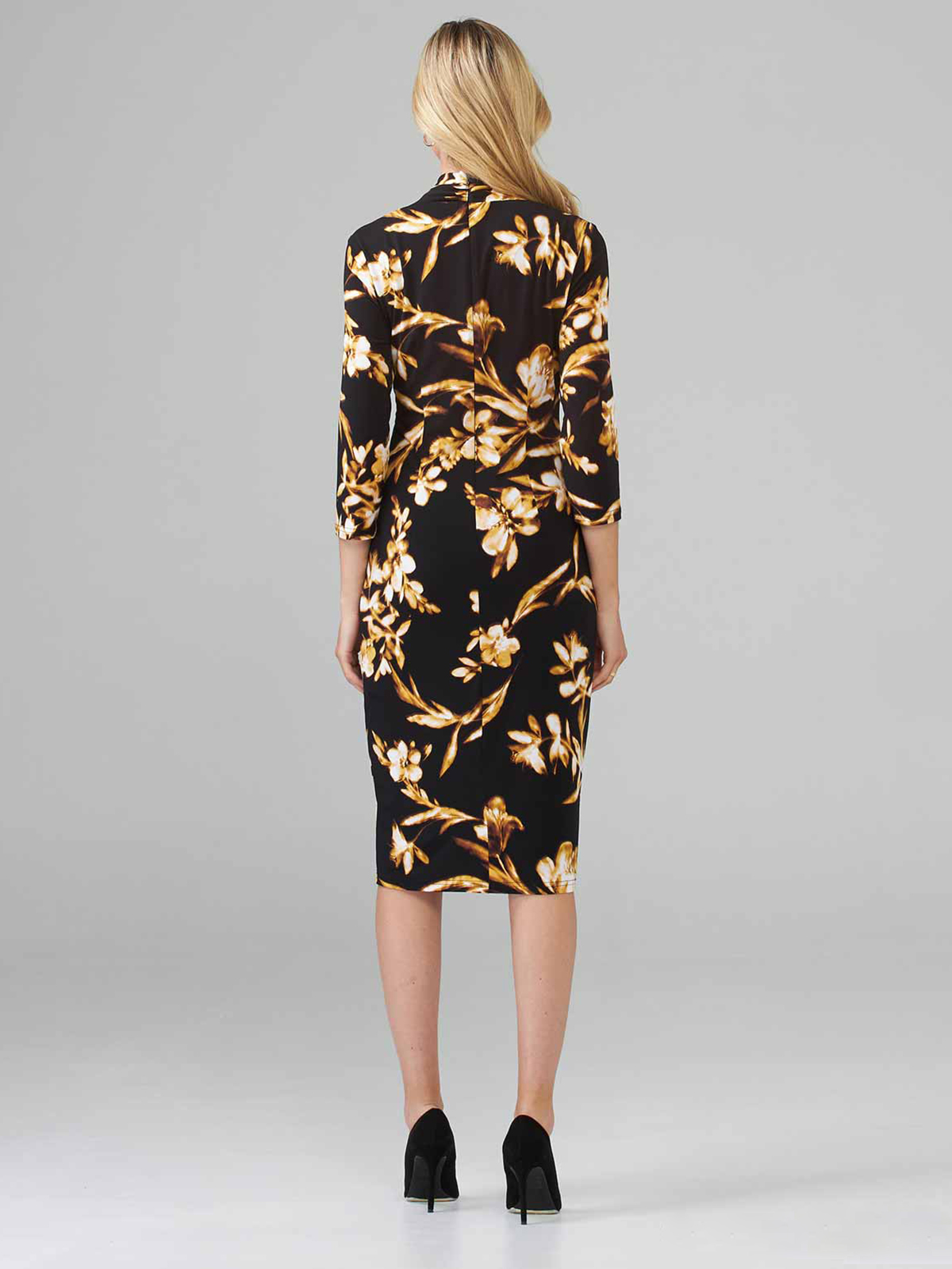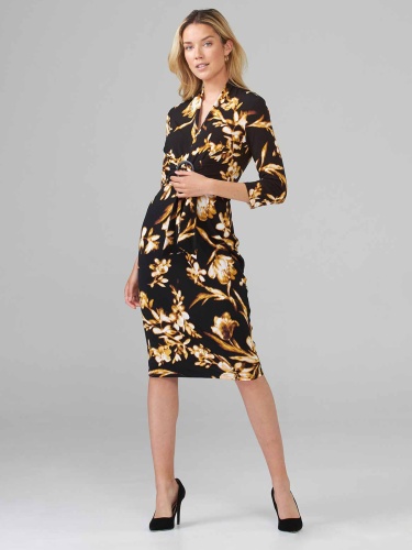 Платье миди с цветочным узором по всей поверхности изделия. Приталенный силуэт, длина ниже колена. V-образный вырез горловины, втачной рукав 3/4.