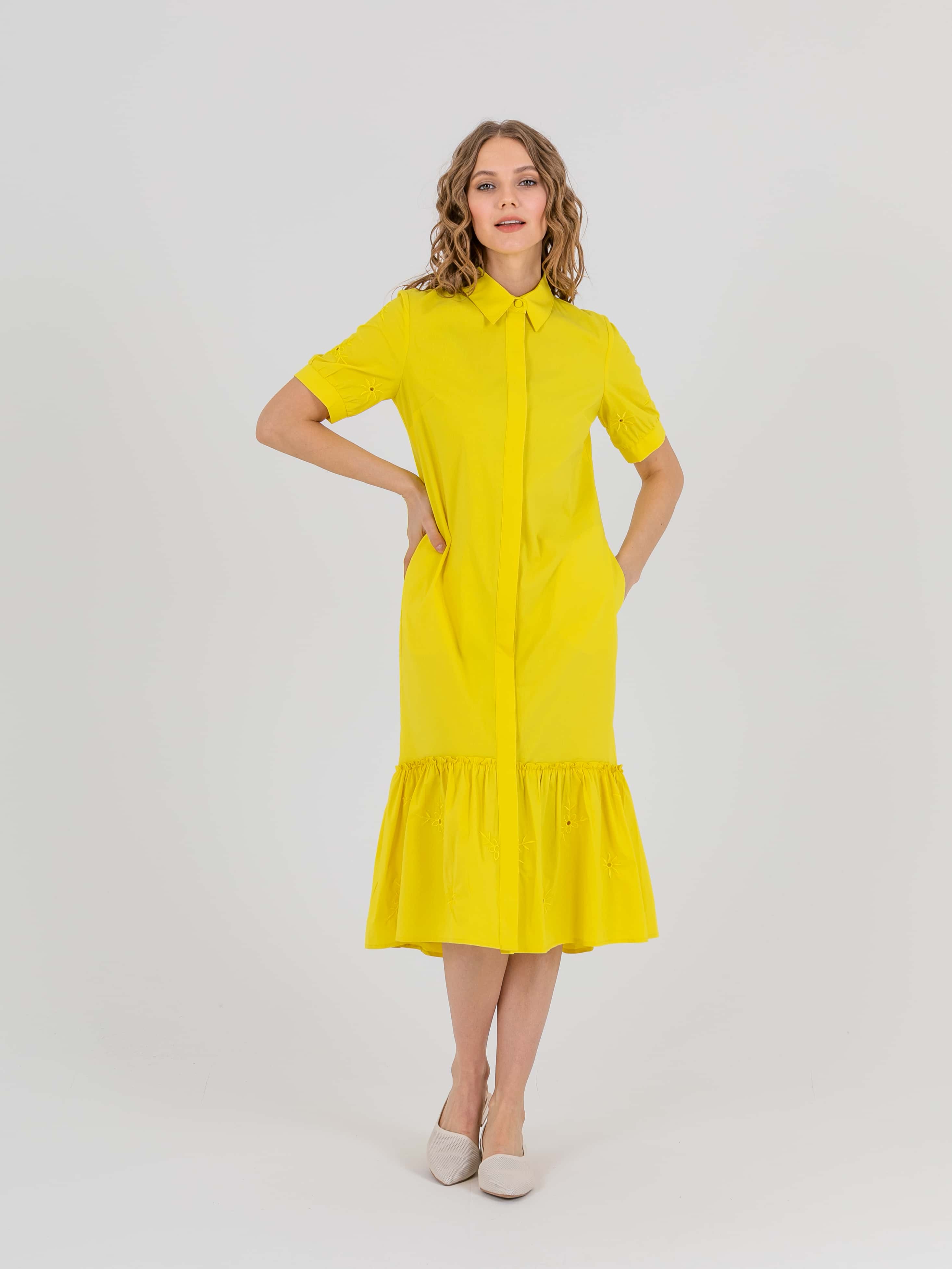 На сайте указаны российские размеры. Платье-рубашка А-силуэта длиной midi с оборкой по низу, дизайнерская особенность - потрясающее хлопковые шитьем растительного орнамента, есть съемный пояс. Перед с двумя вытачками на выпуклость груди, идущими из боковых швов. Застежка потайная на 10 пуговиц. Укороченные втачные рукава «фонарик» с манжетами. Стояче-отложной воротник.