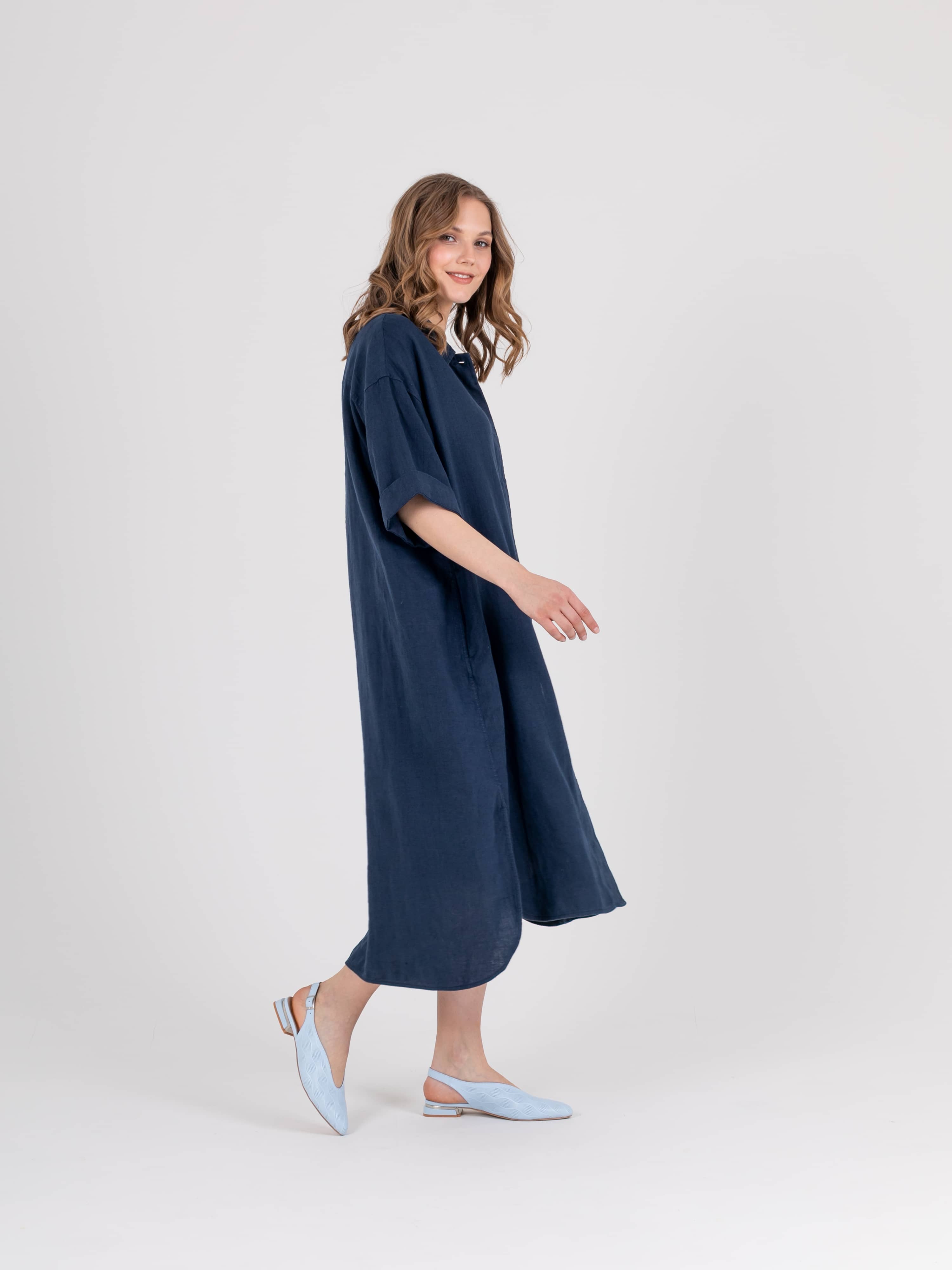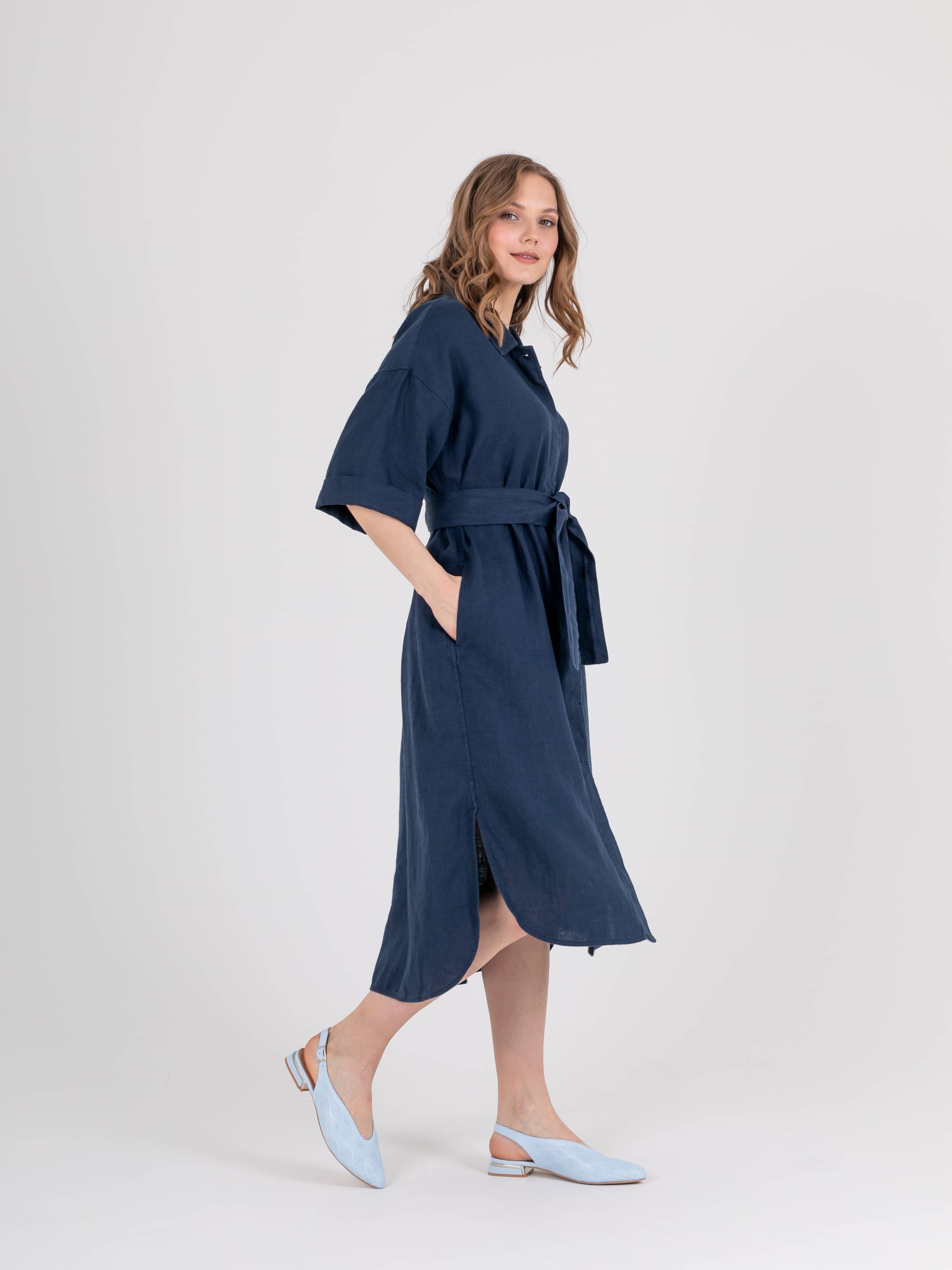 Платье-рубашка прямого силуэта длиной midi из натурального льна с потайной застежкой на 10 прорезных петель и пуговиц, с разрезами в боковых швах и съемным поясом. На спинке прямая кокетка. Укороченные цельнокроеные рукава со спущенной линией плеча. Стояче-отложной воротник.