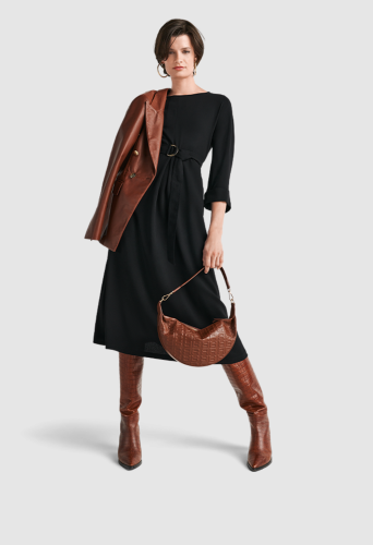 Платье миди из техно-атласа будет стильно и элегантно сопровождать свою обладательницу в течение всего дня. Небольшие акценты, такие как слегка раструбные рукава длиной три четверти, тканевый пояс с красивым металлическим элементом и струящаяся юбка, расставляют акценты.