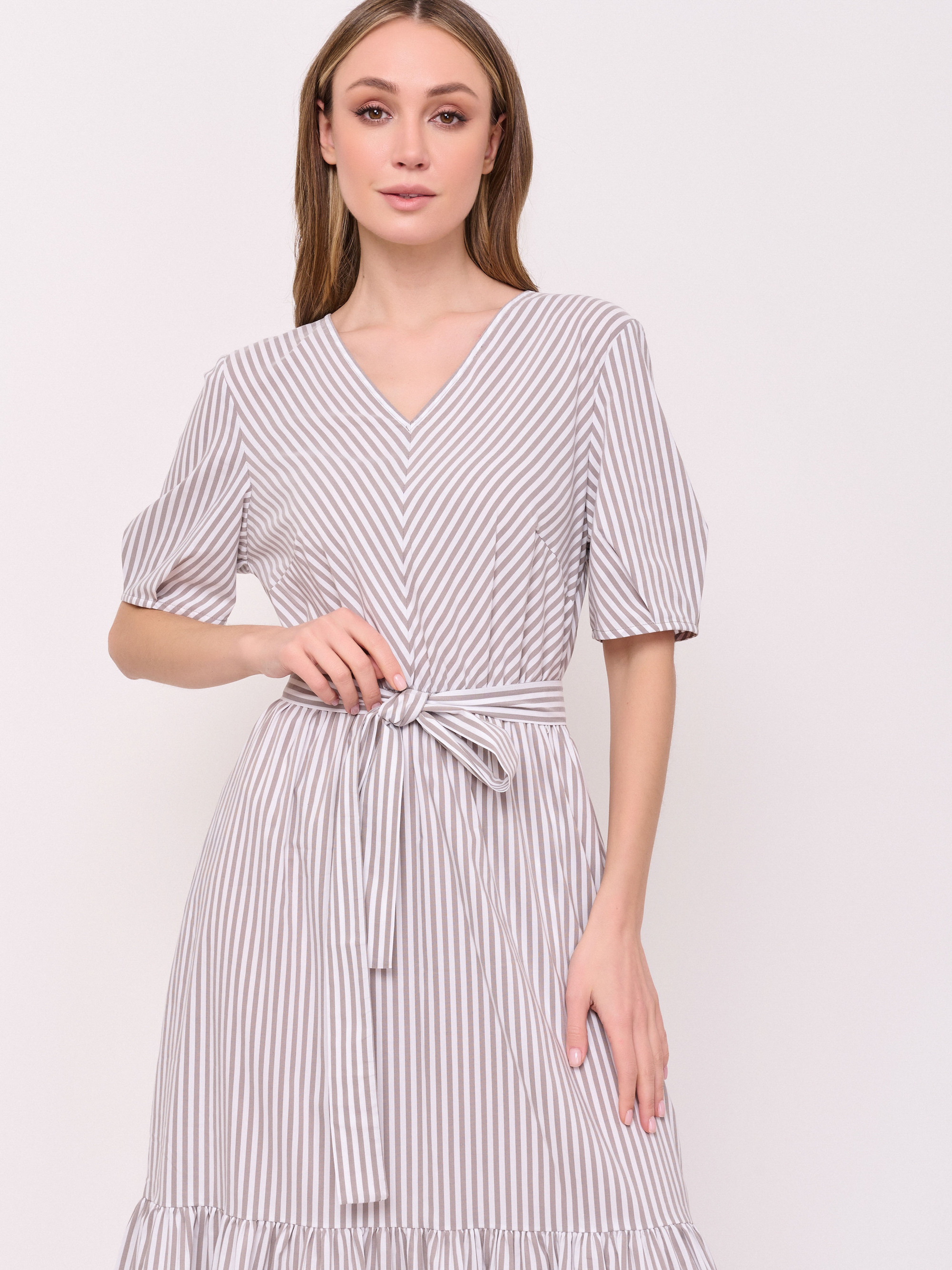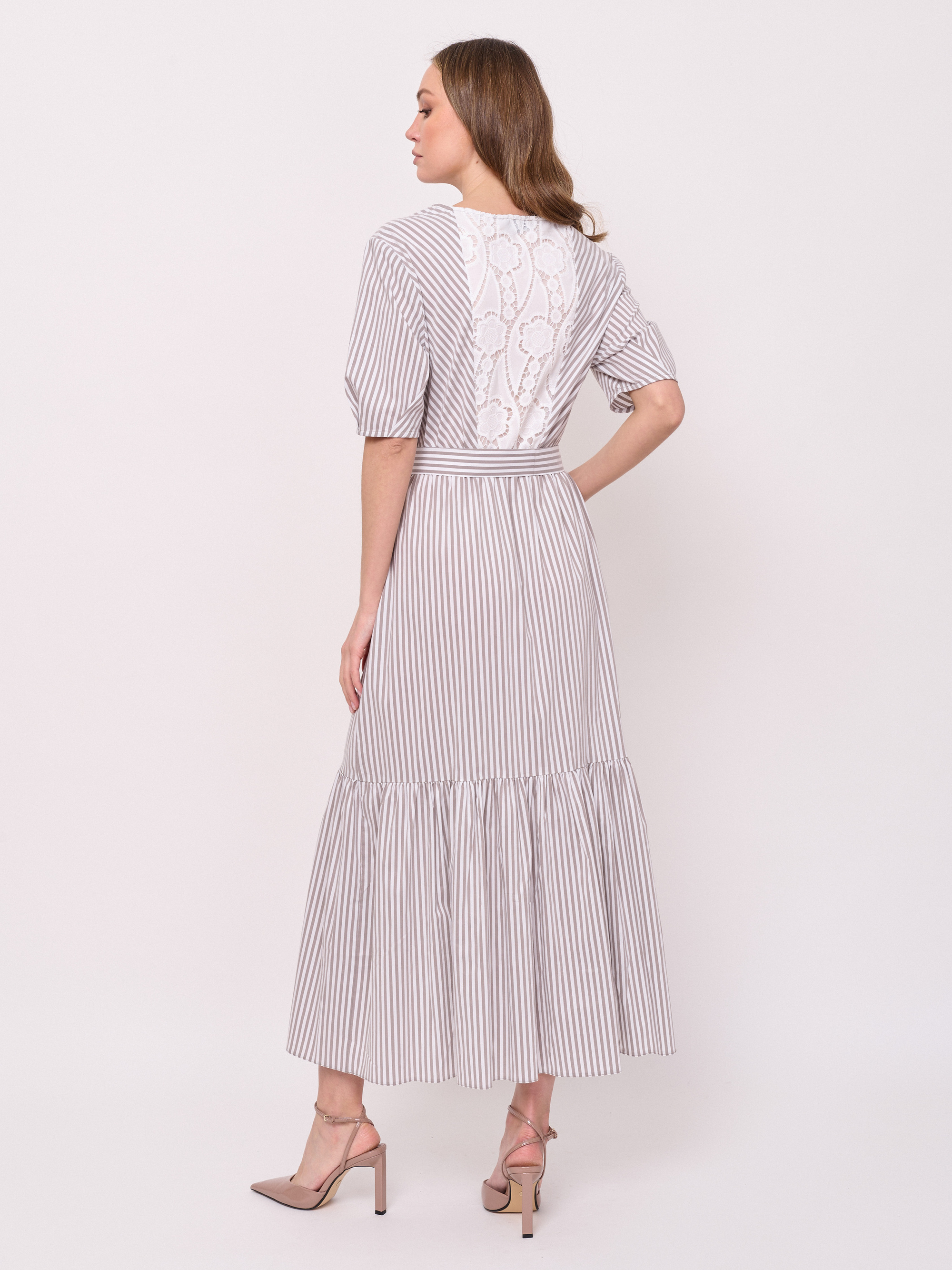 Детали: без застежки, вырез горловины v-образный, рукава короткие, покрой расклешенный, рисунок полоска, карманы в шве, конструктивные элементы воланы, длина платья макси, резинка по линии талии, пояс из основной ткани, ажурная спинка. Длина по спинке: 129 см.
