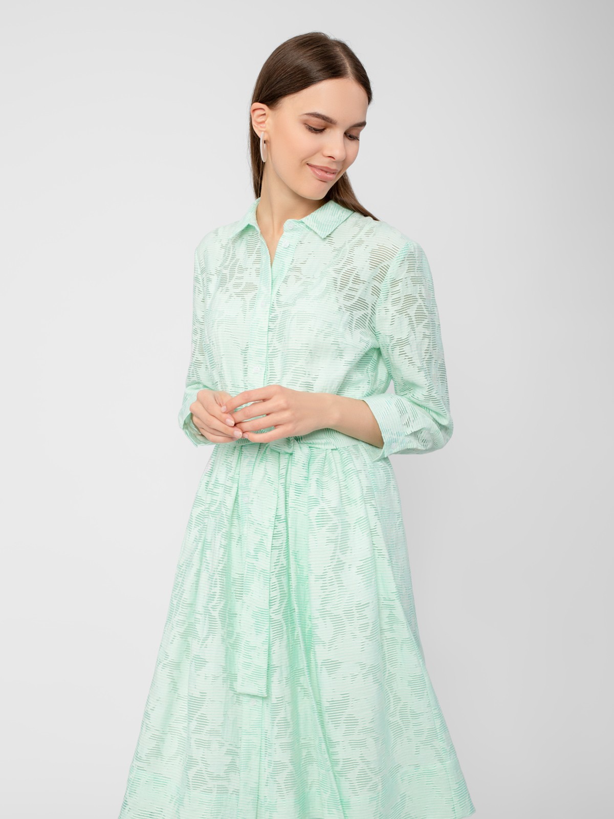 Платье-рубашка из плательной ткани с принтом. Силуэт трапеция, классический отложной воротник, втачной рукав на манжете, застежка спереди на пуговицы. На талии съемный пояс из основной ткани.