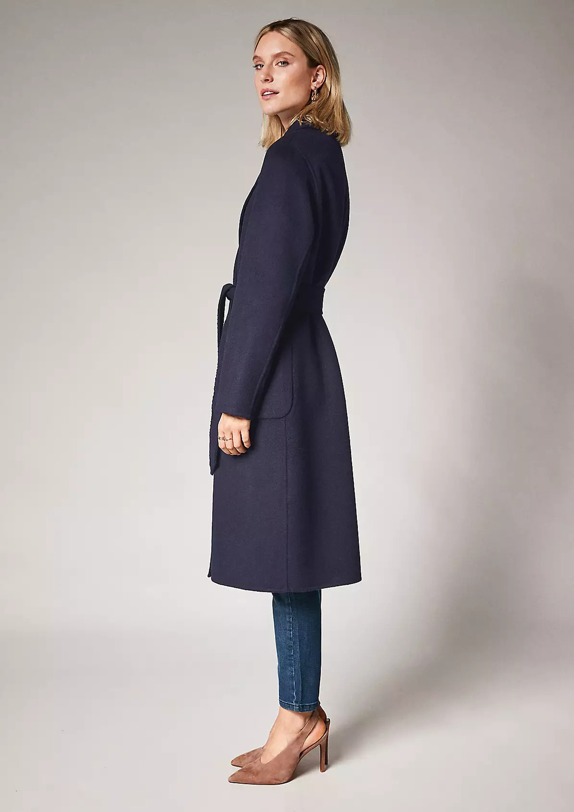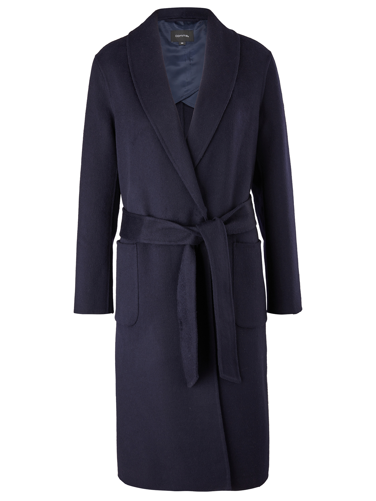 Драповое пальто-халат с отложным воротником с лацканами. В комплекте идет пояс из основного материала изделия. Накладные карманы.