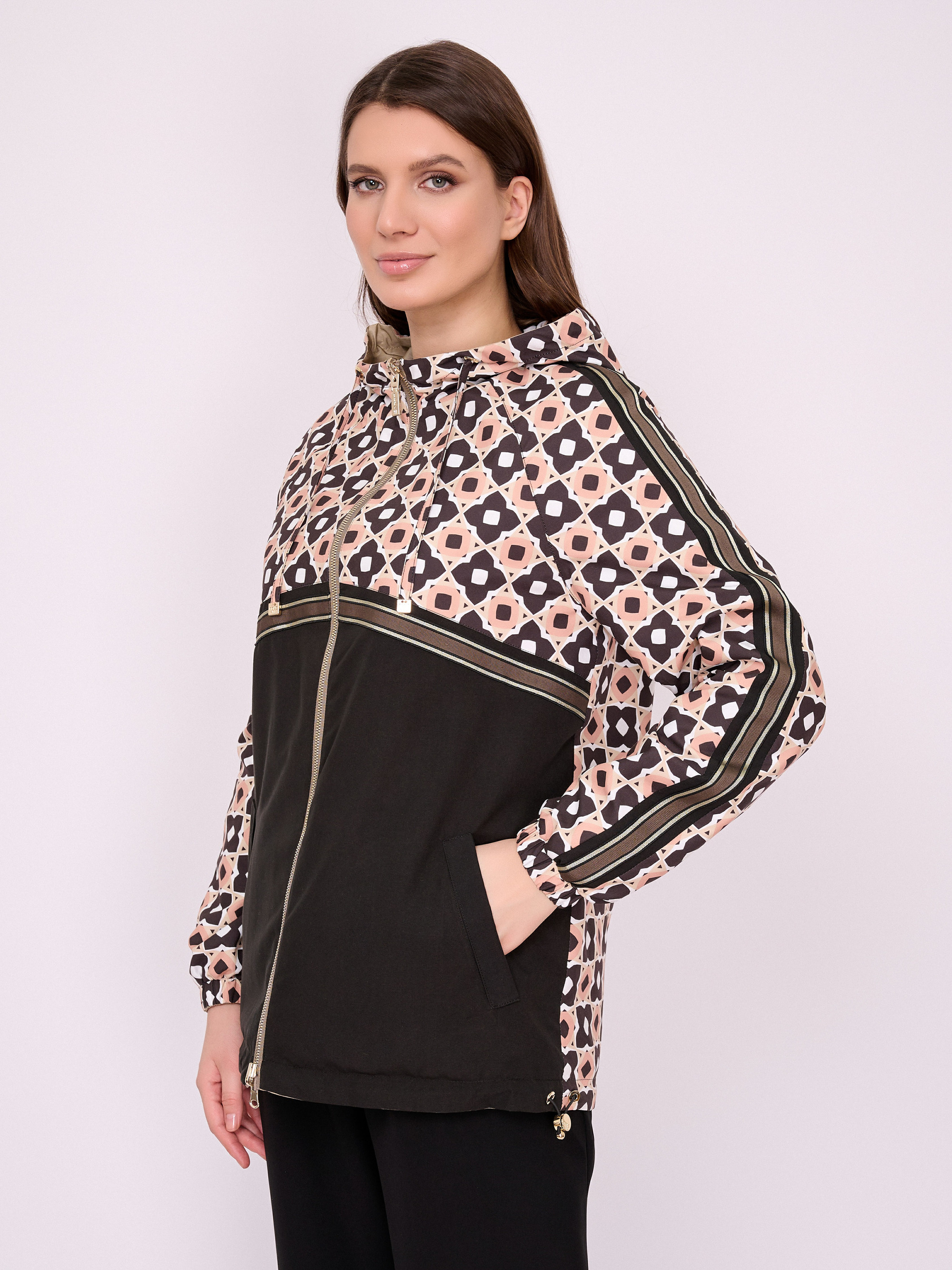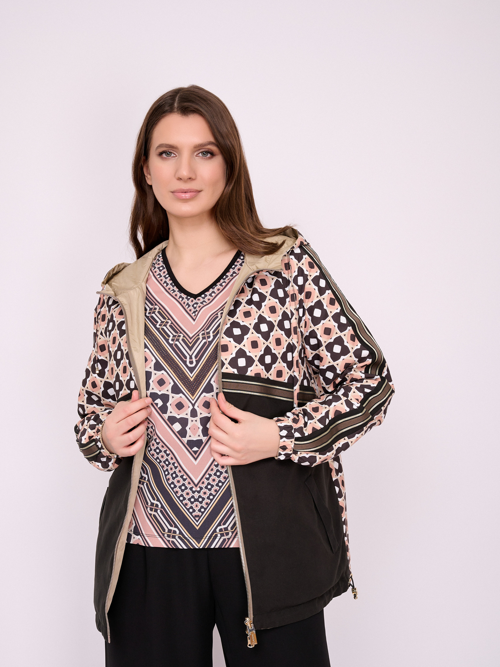 На сайте указаны российские размеры. Прямая двусторонняя куртка на молнии, с воротником капюшоном на завязках, с длинным рукавом-регланом, с прорезными карманами. Одно сторона куртки выполнена в бежевом цвете, вторая сторона куртки выполнена в черном цвете с геометрическим рисунком. Длина по спинке: 69 см. Рост модели: 175 см.