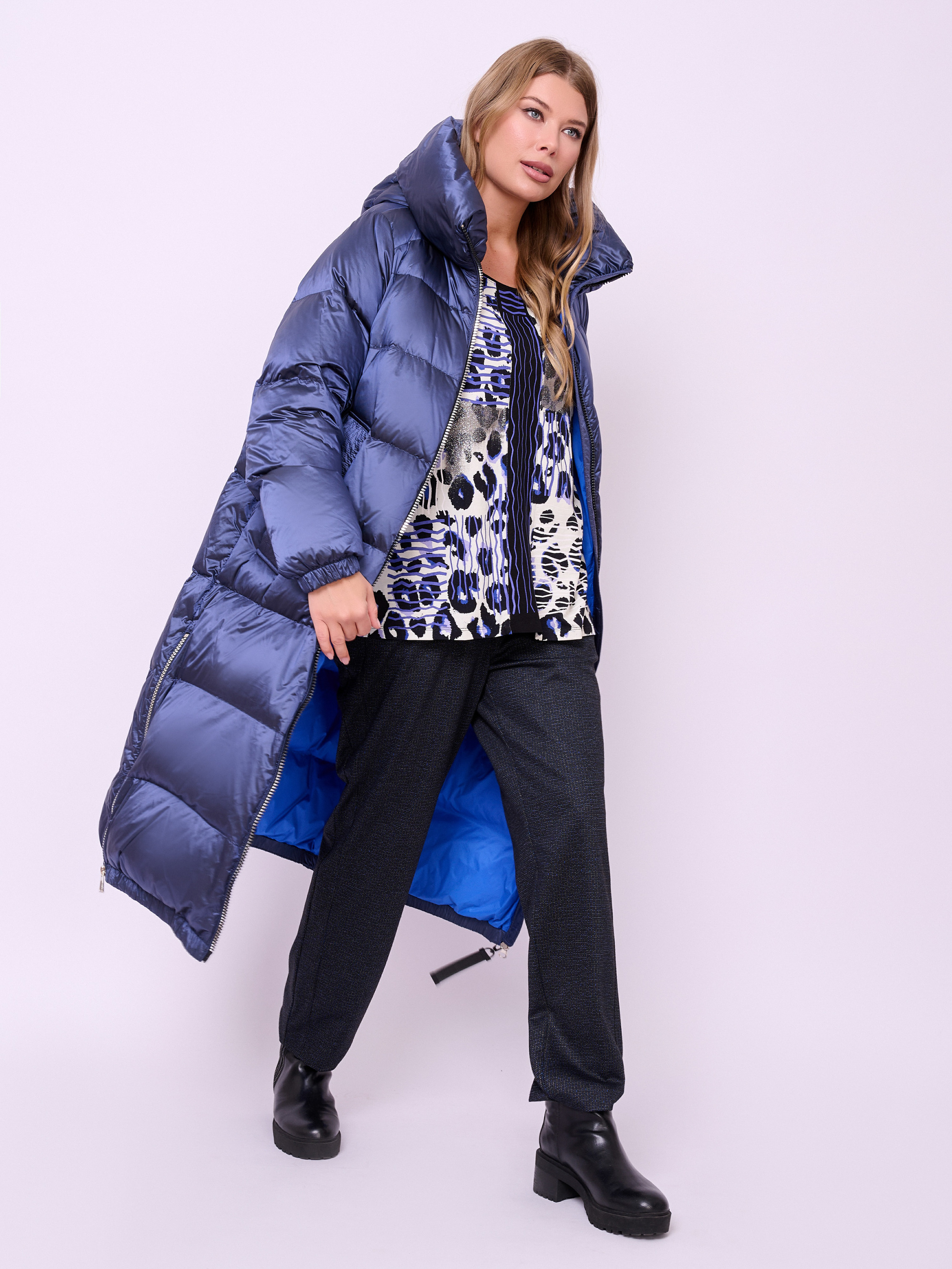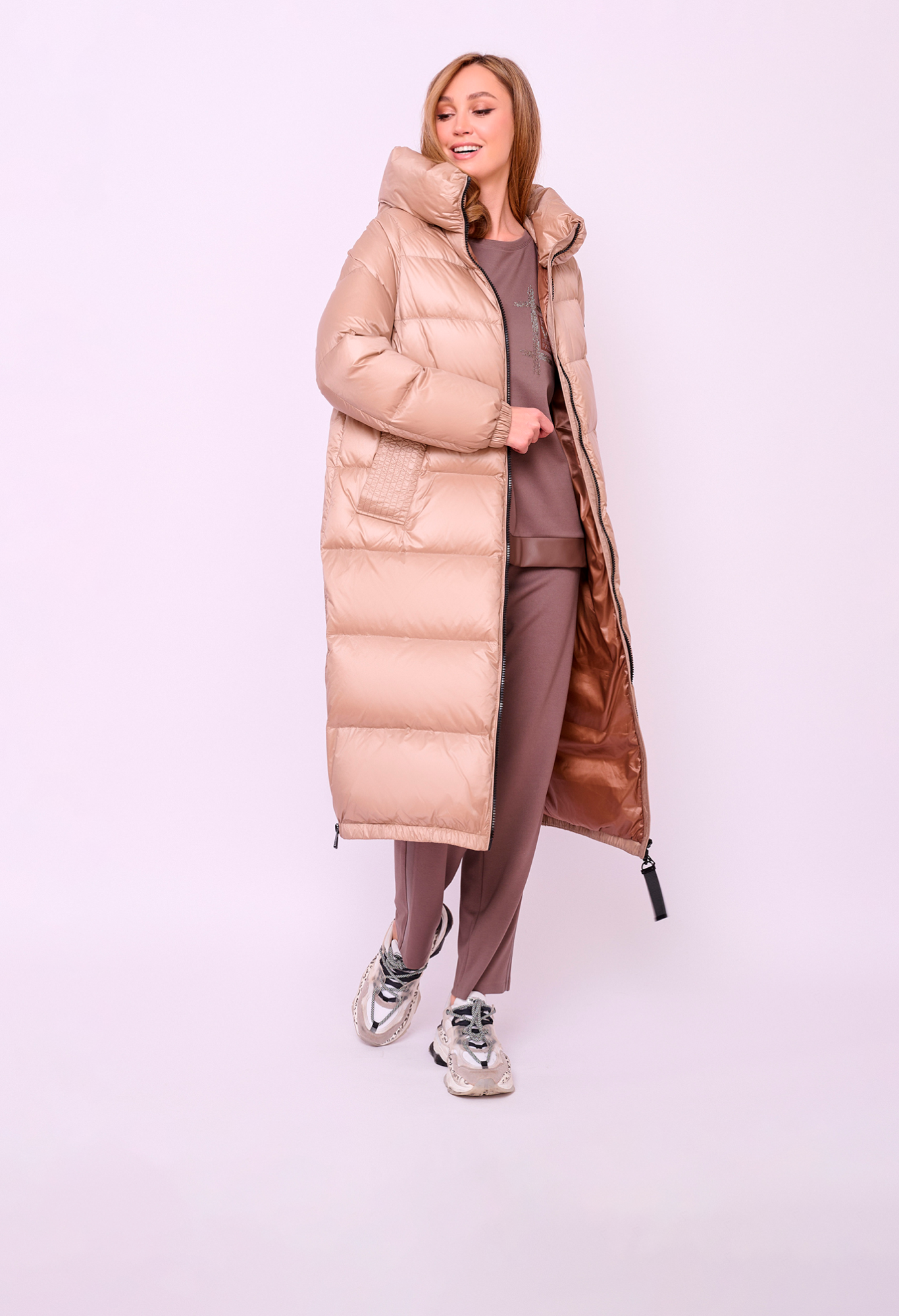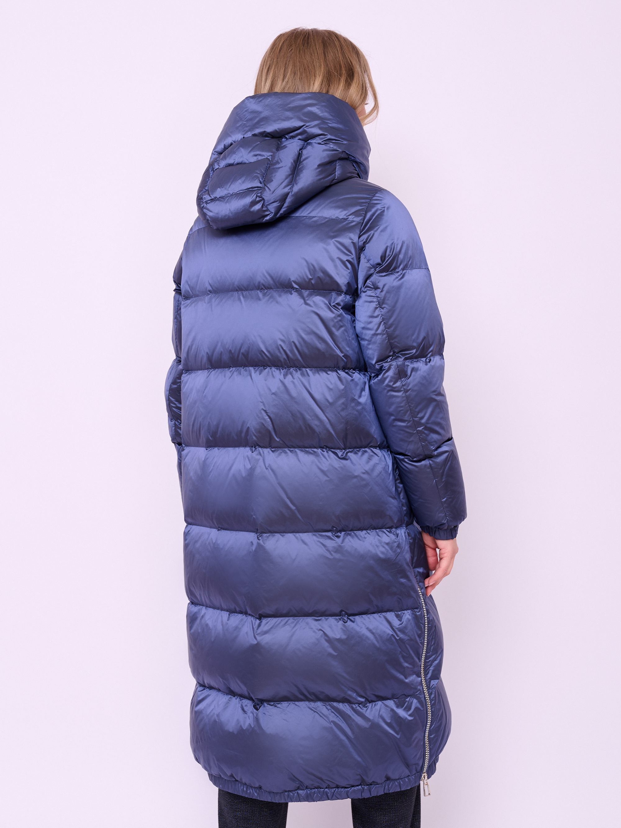 Пальто-пуховик стеганое с высоким воротом, несъемным капюшоном на кулиске без опушки, с длинными рукавами на резинке, прорезными карманами на магнитной кнопке, высокими разрезами на молнии и низом на резинке. Длина по спине: 112 см