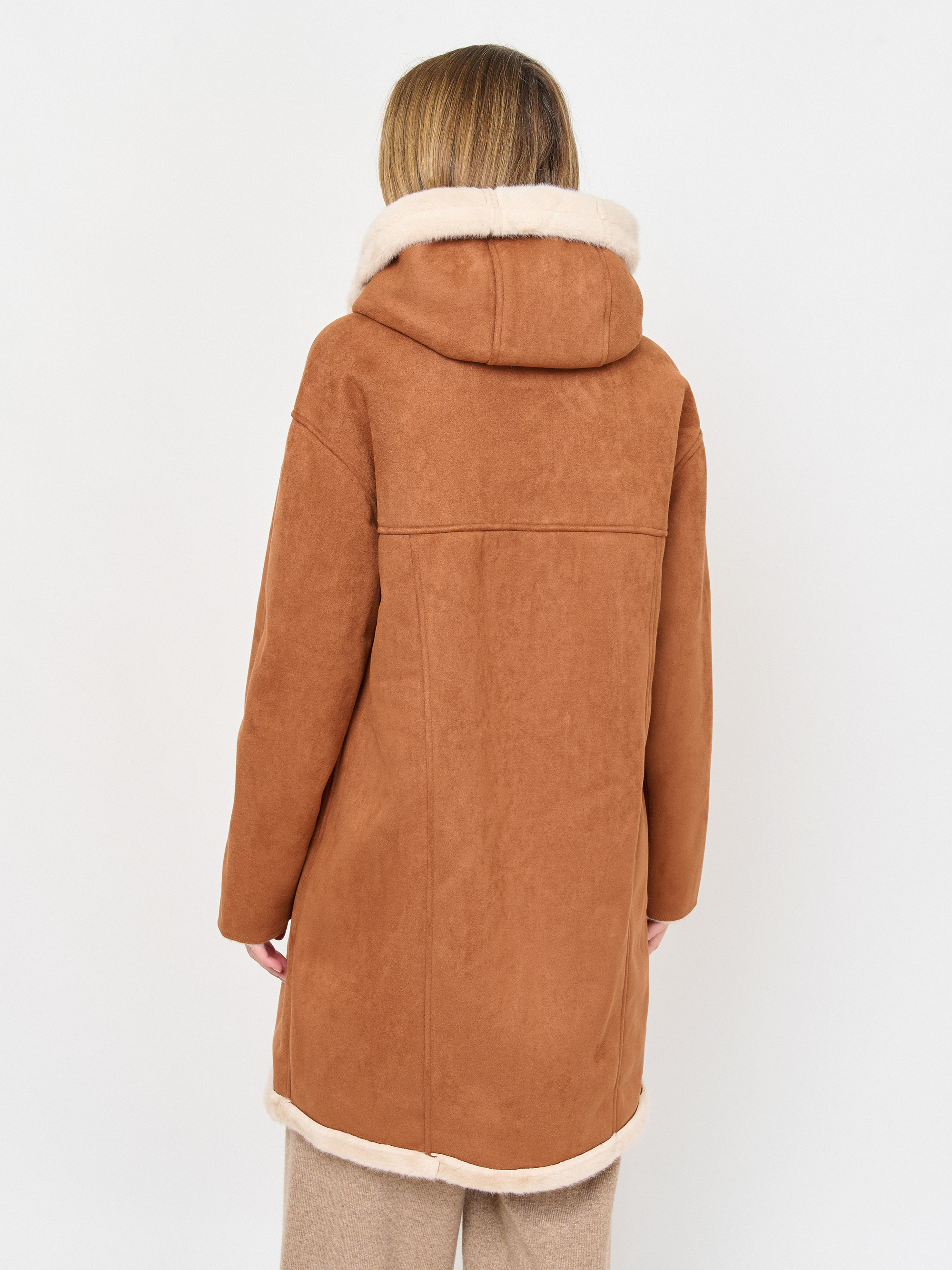 Пальто-дублёнка из экоовчины рассчитана на температурный диапазон от 0 до -10°C. Ткань верха: искусственная замша с искусственным мехом; ткань верха: искусственная замша с искусственным мехом под овчину. Детали: искусственный мех и замша, застежка пуговицы, опции капюшона несъемный капюшон, рукава длинные, покрой прямой, без рисунка, утеплитель экомех, карманы прорезные, опции опушки несъемная опушка.