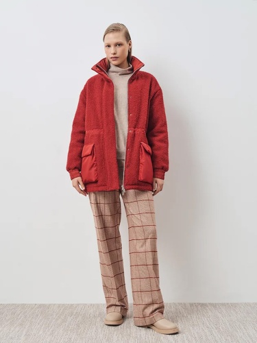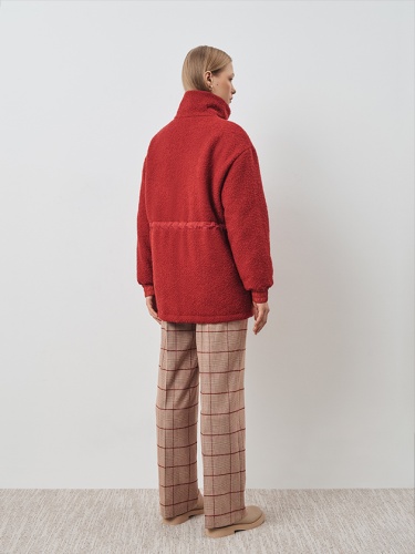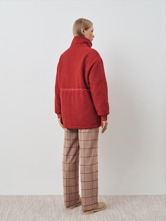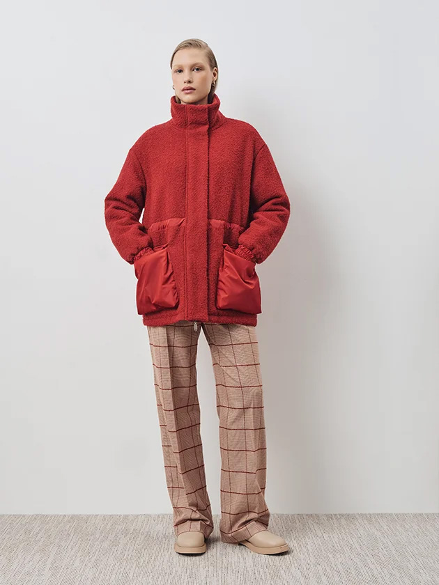 Куртка прямого силуэта, из шерсти букле цвета калоглосса. Карманы, линия пояса и внутренняя отделка выполнены из плащевой ткани в тон основной ткани. Разные фактуры создают интригующие акценты. Манжеты также выполнены из плащевки, что добавляет функциональности рукаву. Кулиска по талии позволяет комфортно трансформировать силуэт.