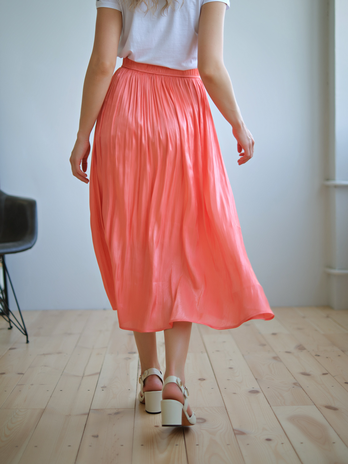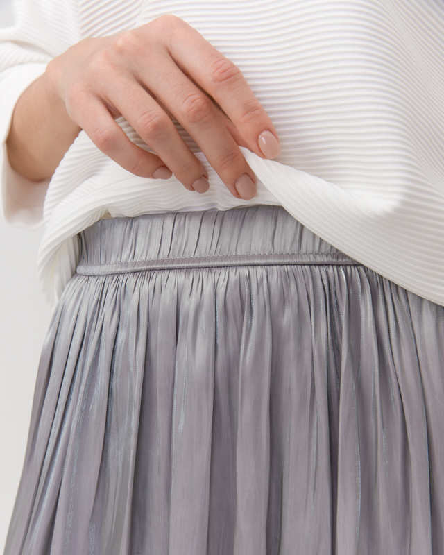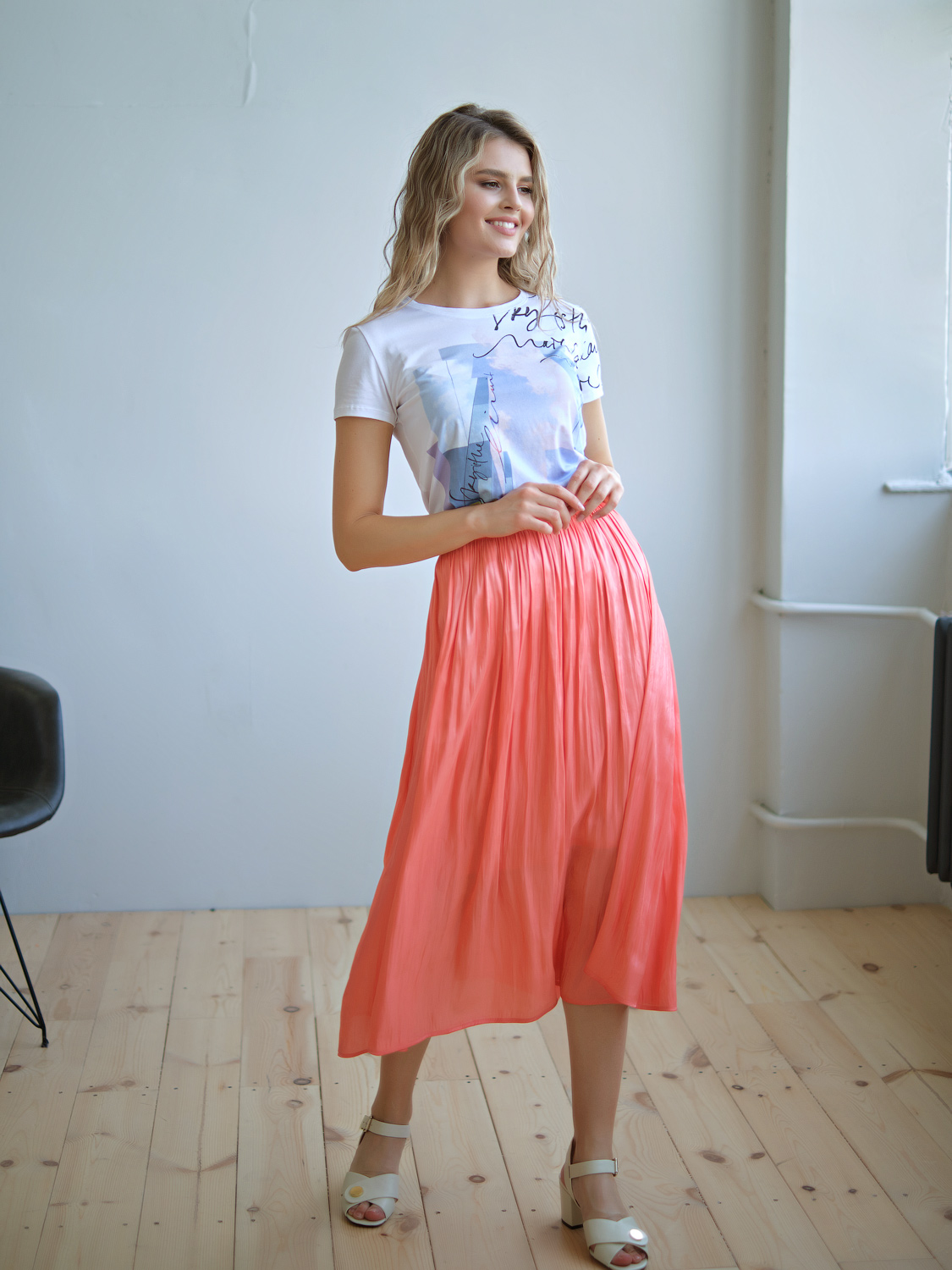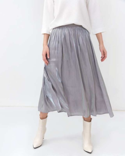 Юбка миди универсального А-силуэта подойдет как для повседневного, так и для праздничного образа. Выполнена из ткани с металлическим отливом. Материал подкладки – вискоза с добавлением эластана. Эластичный пояс обеспечивает комфортную посадку и удобство ношения.