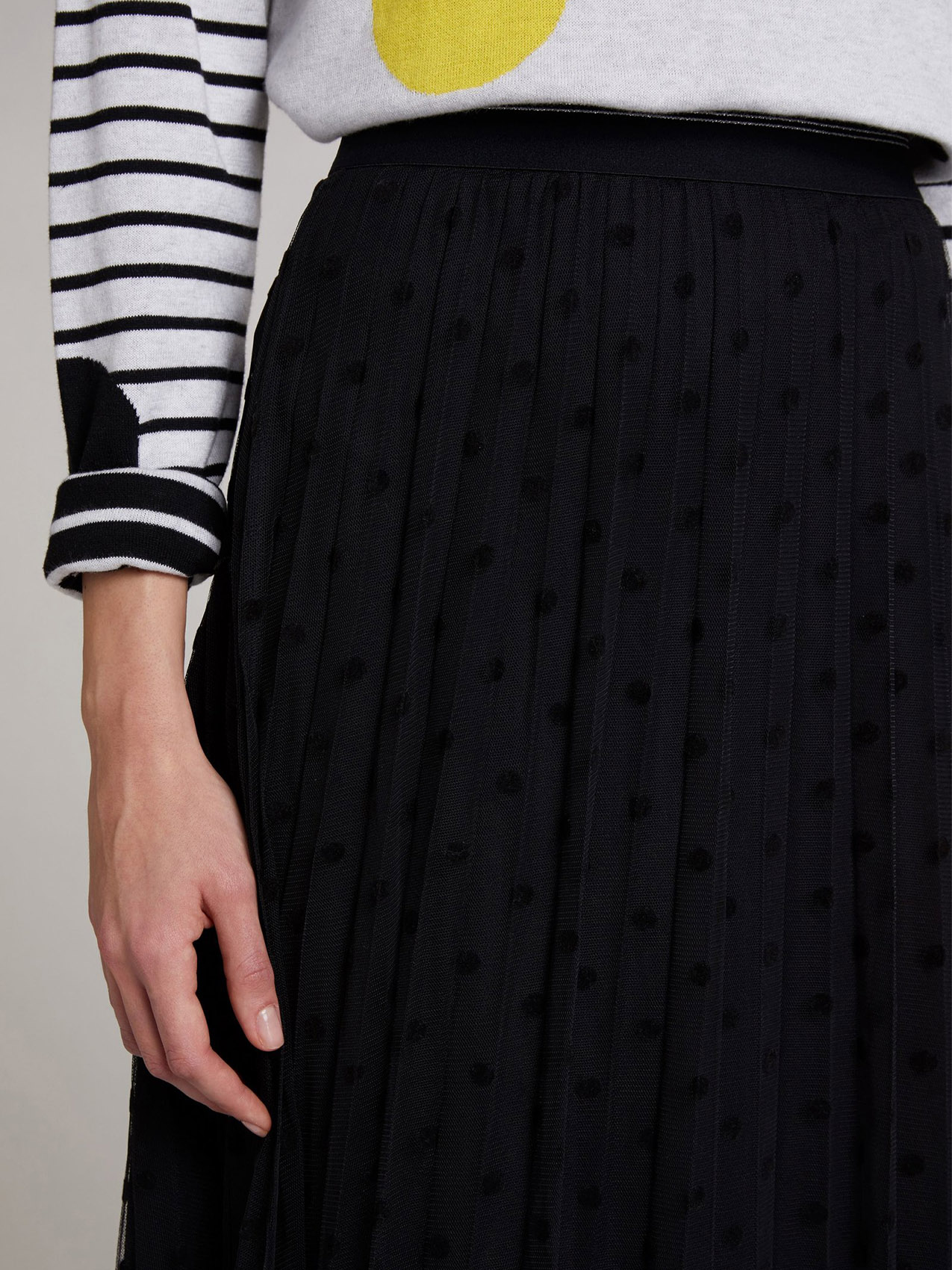 Двуслойная юбка длины миди со складками плисе. Верхний слой выполнен из сетки и украшен узором в горох. Эластичный пояс обеспечивает комфортную посадку и удобство повседневного ношения. Юбку хорошо сочетать с футболкой и кроссовками для создания повседневного образа в городском стиле.