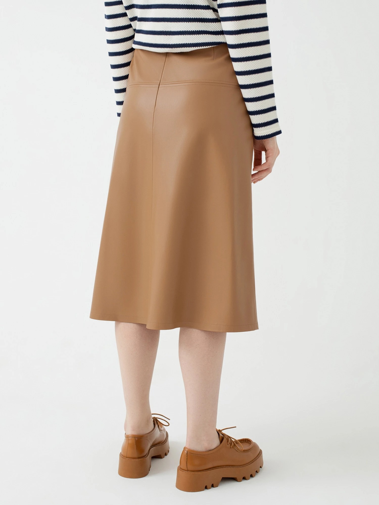 На сайте указаны Российские размеры Юбка силуэта трапеция из экокожи карамельного цвета длины миди. В боковых швах два функциональных прорезных кармана. В качестве декоративных элементов - вертикальная и горизонтальная отстрочки. Юбка послужит отличной осенней базовой вещью, которая добавит модный акцент в любой образ. Рост модели на фото - 175 см.