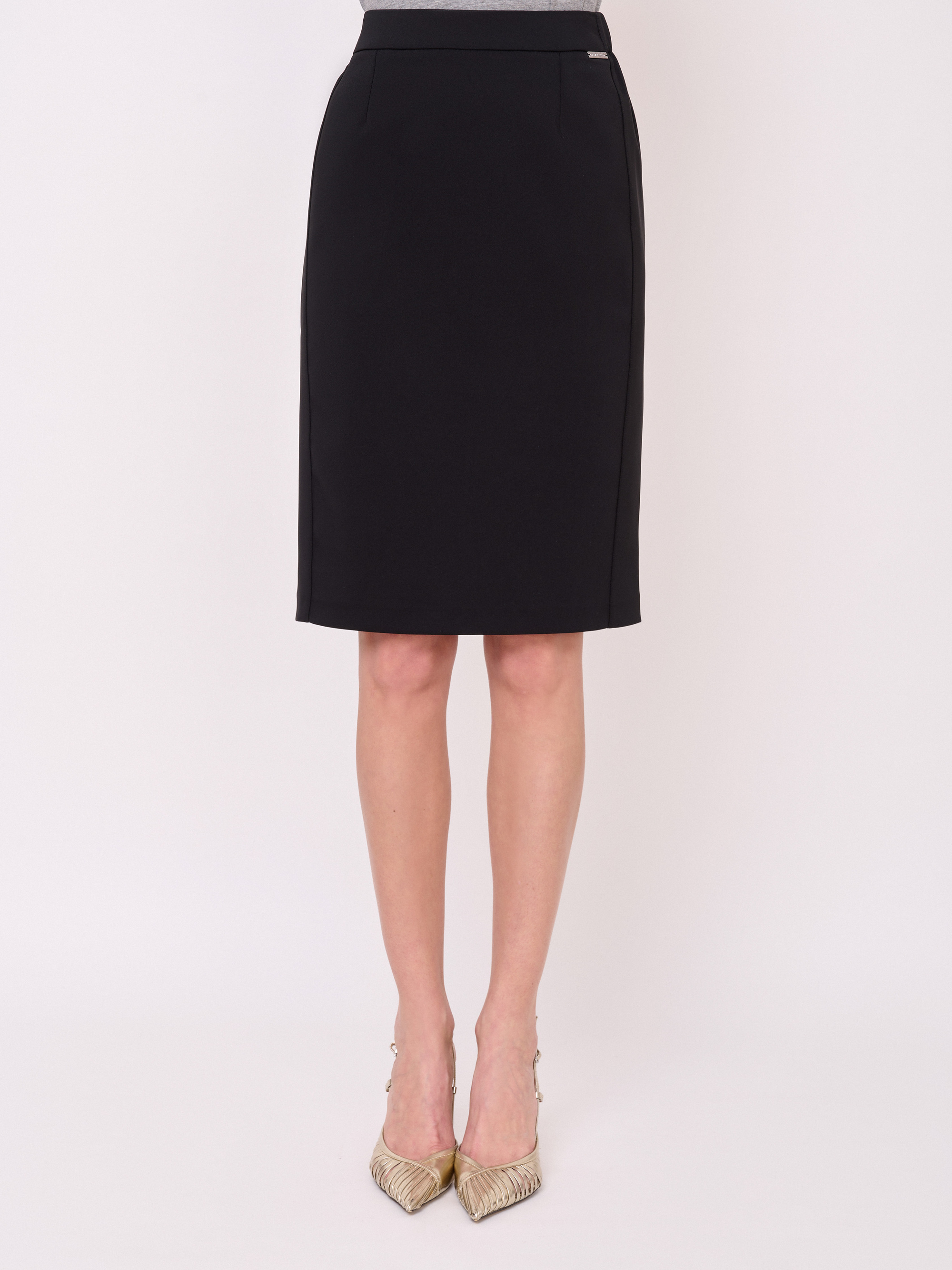 Застежка молния, покрой прямой, эластичные вставки сбоков по линии талии, посадка средняя, без рисунка, без карманов, конструктивные элементы шлица, модель юбки прямая, длина юбки миди.