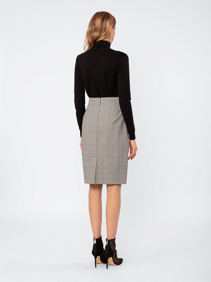 Классическая юбка прямого силуэта, длина до середины колена, на подкладке. Застежка на молнию. На пртиачном поясе. Сзади шлица.
