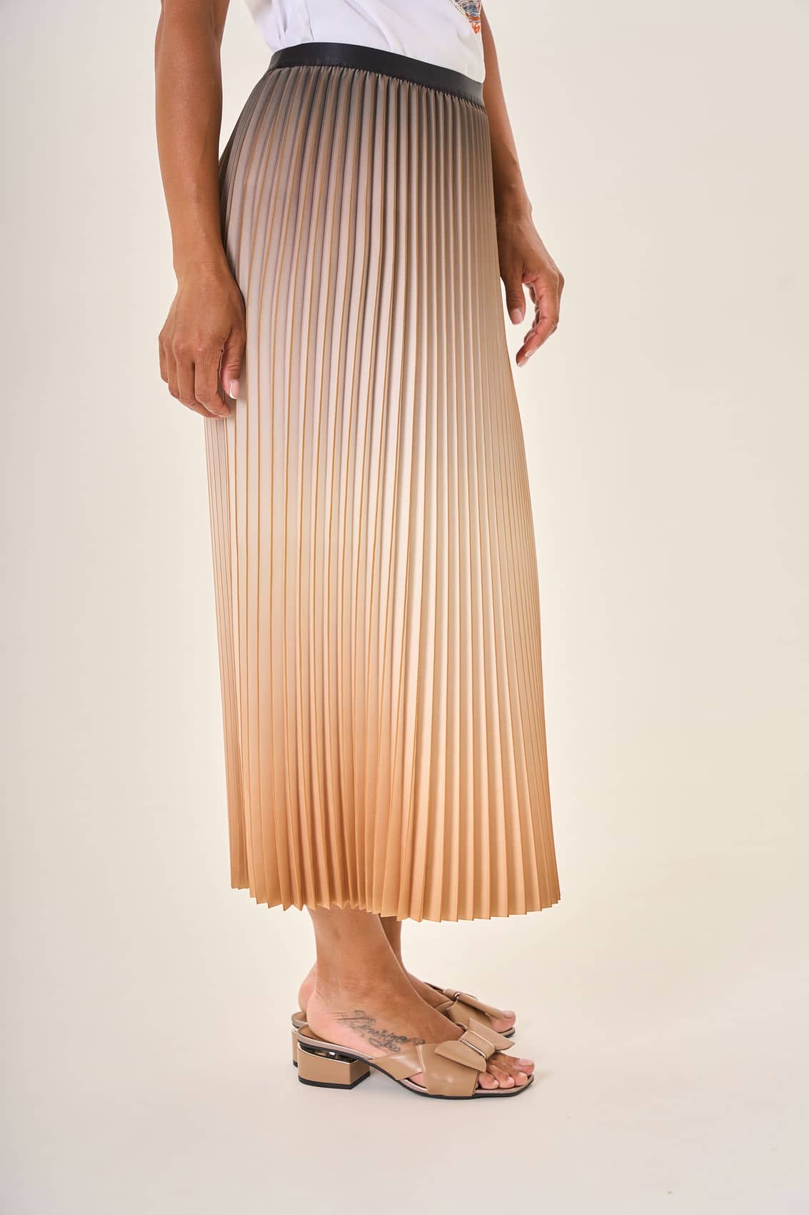 Плиссированная юбка средней длины с плавным градиентом,перетекающим от благородного серо-коричневого к роскошному золотистому оттенку. Завершающий штрих образа — контрастный чёрный пояс, подчёркивающий талию и добавляющий динамики силуэту.