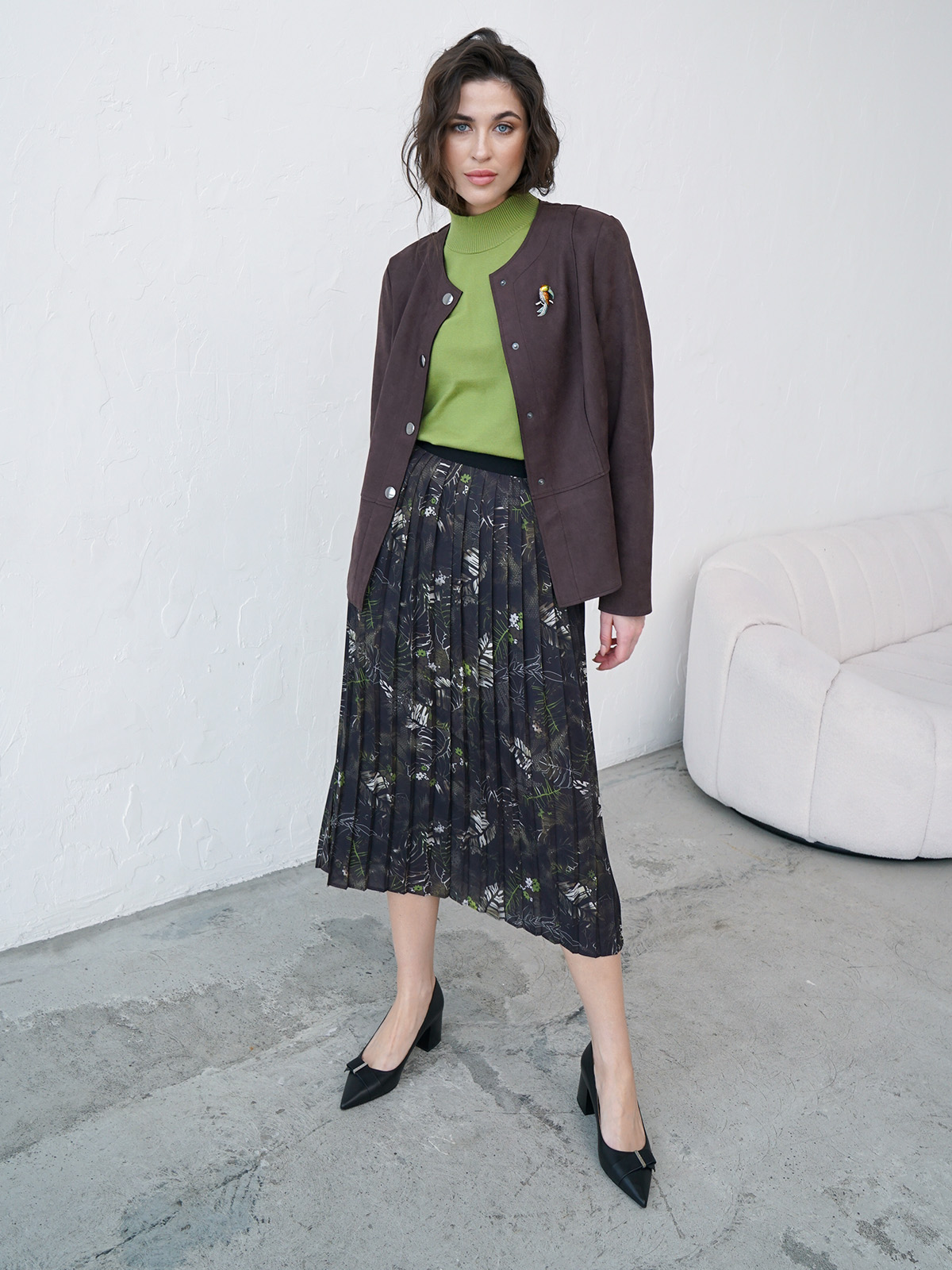 Однотонный жакет насыщенного шоколадного оттенка. Овальный вырез горловины, воротник отсутсвует. Застежка на кнопки, длинный втачной рукав, боковые прорезные карманы с листочкой.