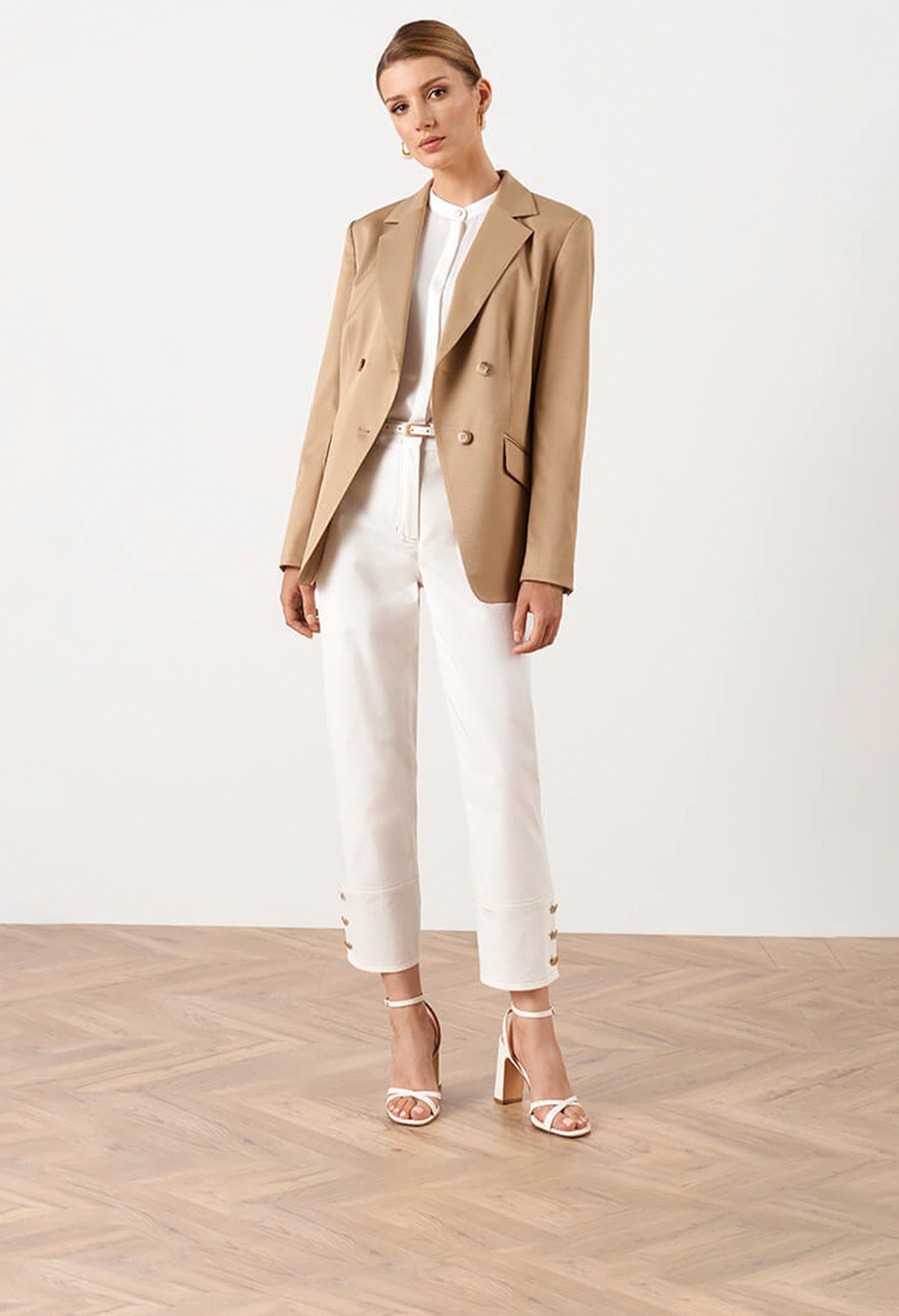 Стильный двубортный жакет прямого силуэта. Отложной воротник с лацканами. Застежка на три роговые пуговицы. Рукава заканчиваются шлицей с имитацией застежки на роговые пуговицы. Спереди имитация карманов с клапанами. Средний шов спинки заканчивается шлицей. Подкладка с дизайнерским принтом «Гортензия».