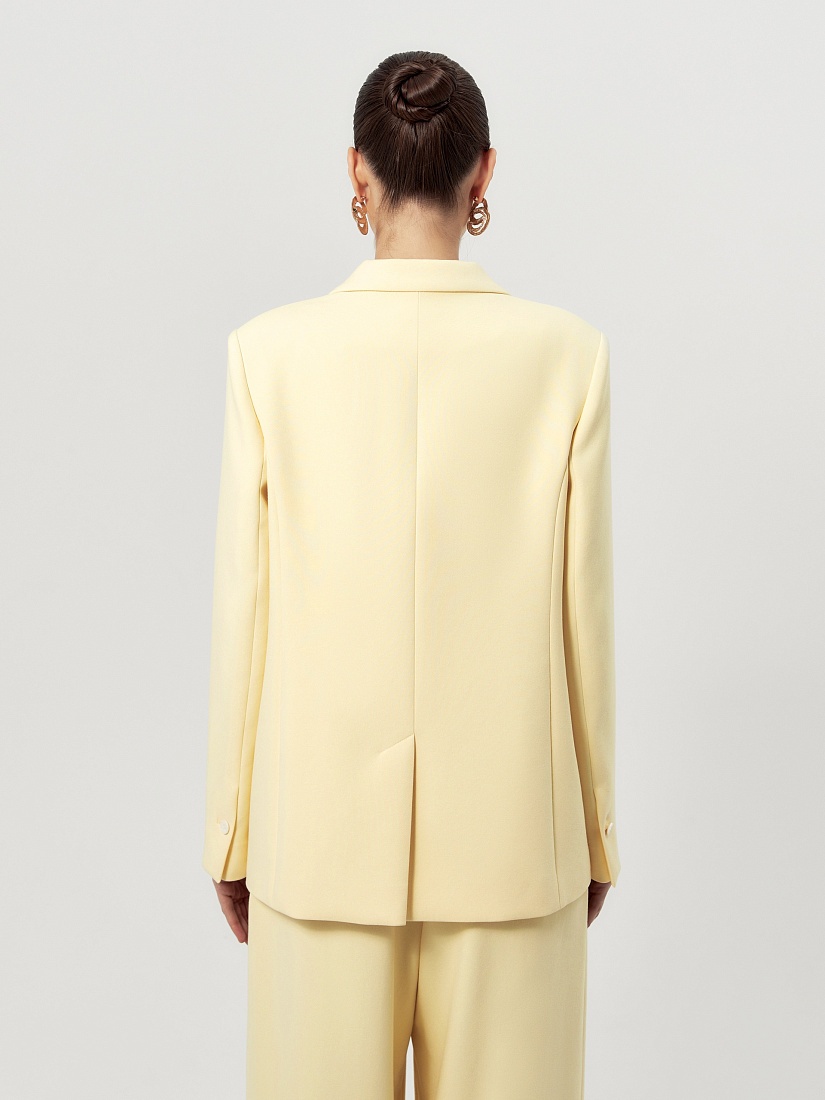 Удлиненный двубортный жакет прямого силуэта в нежно-желтом цвете из хлопковой костюмной ткани. Рукав полной длины с одной пуговицей на шлице. Прорезной карман с клапаном. Жакет на подкладке.