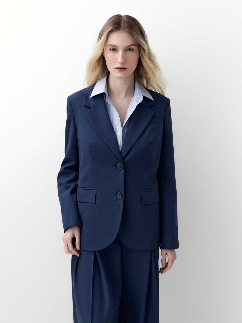 Удлиненный прямой однобортный жакет с V-образным вырезом и английским воротником. Жакет на двух пуговицах с прорезными карманами и клапанами, на спинке шлица.