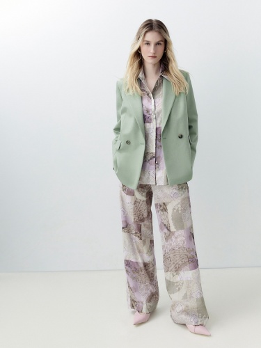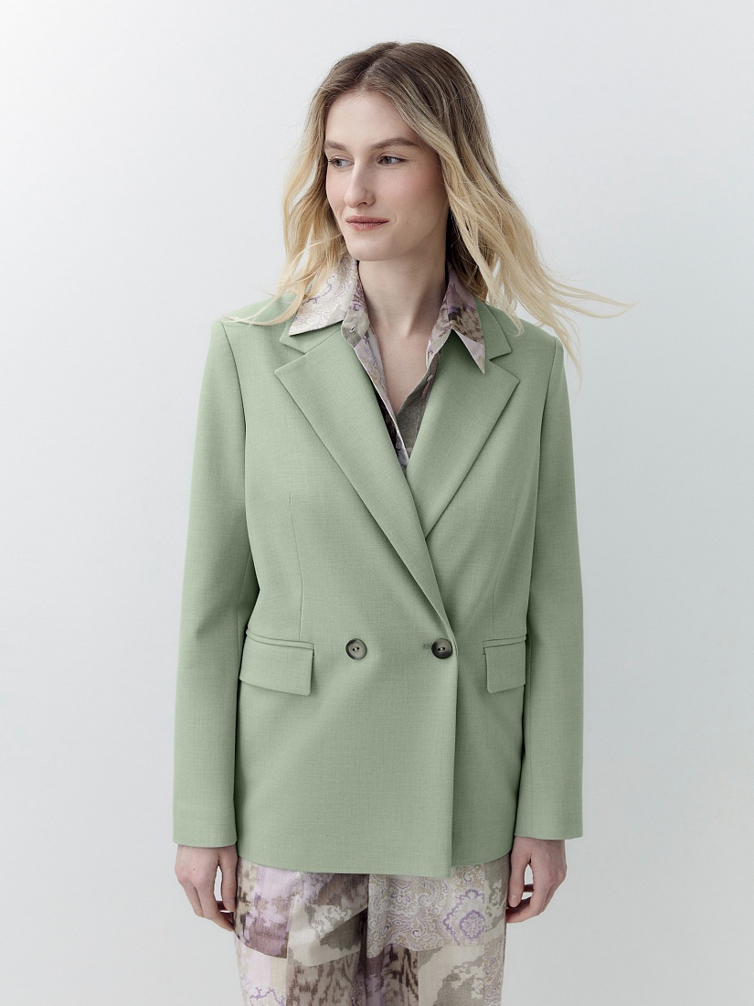 Однобортный жакет на подкладке со спущенной линией плеча и округлыми лацканами. Прорезные карманы с клапанами. Жакет выполнен из костюмной ткани в модном цвете "зеленая дымка". Жакет на подкладке.